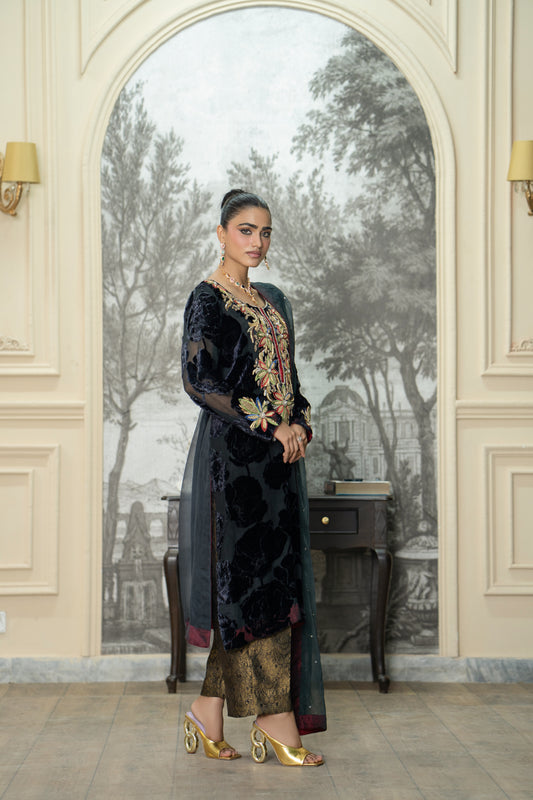 Radiate opulence in this exquisite midnight blue formal suit. The luxurious velvet kameez is a...