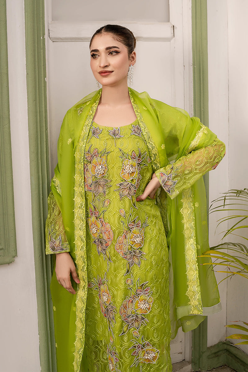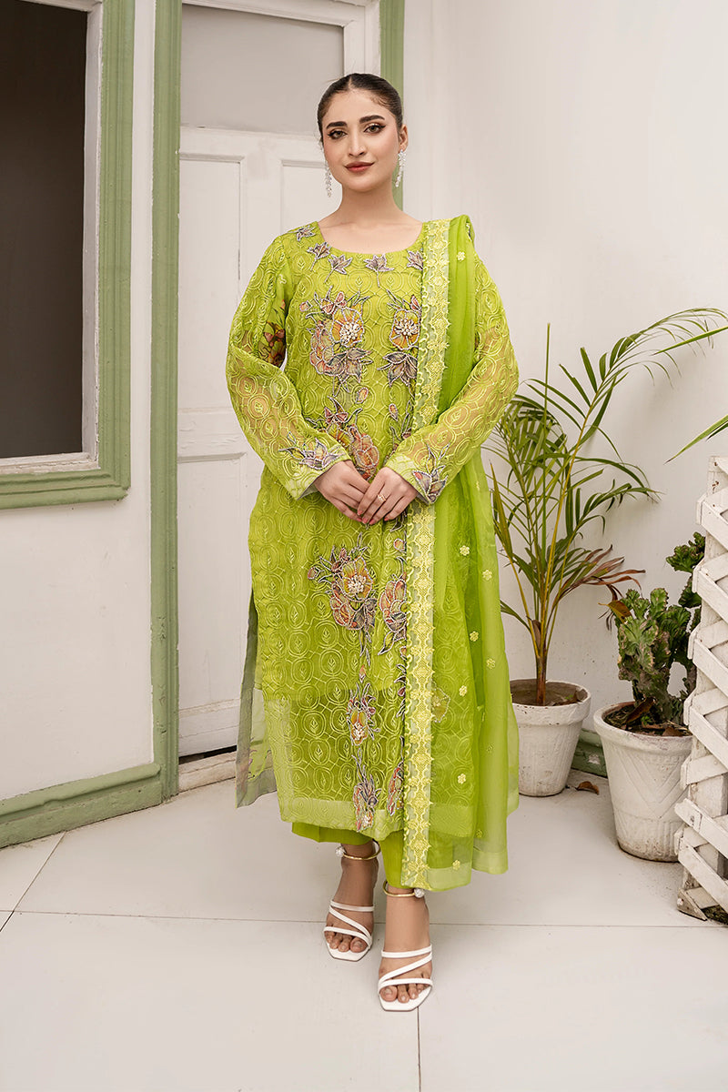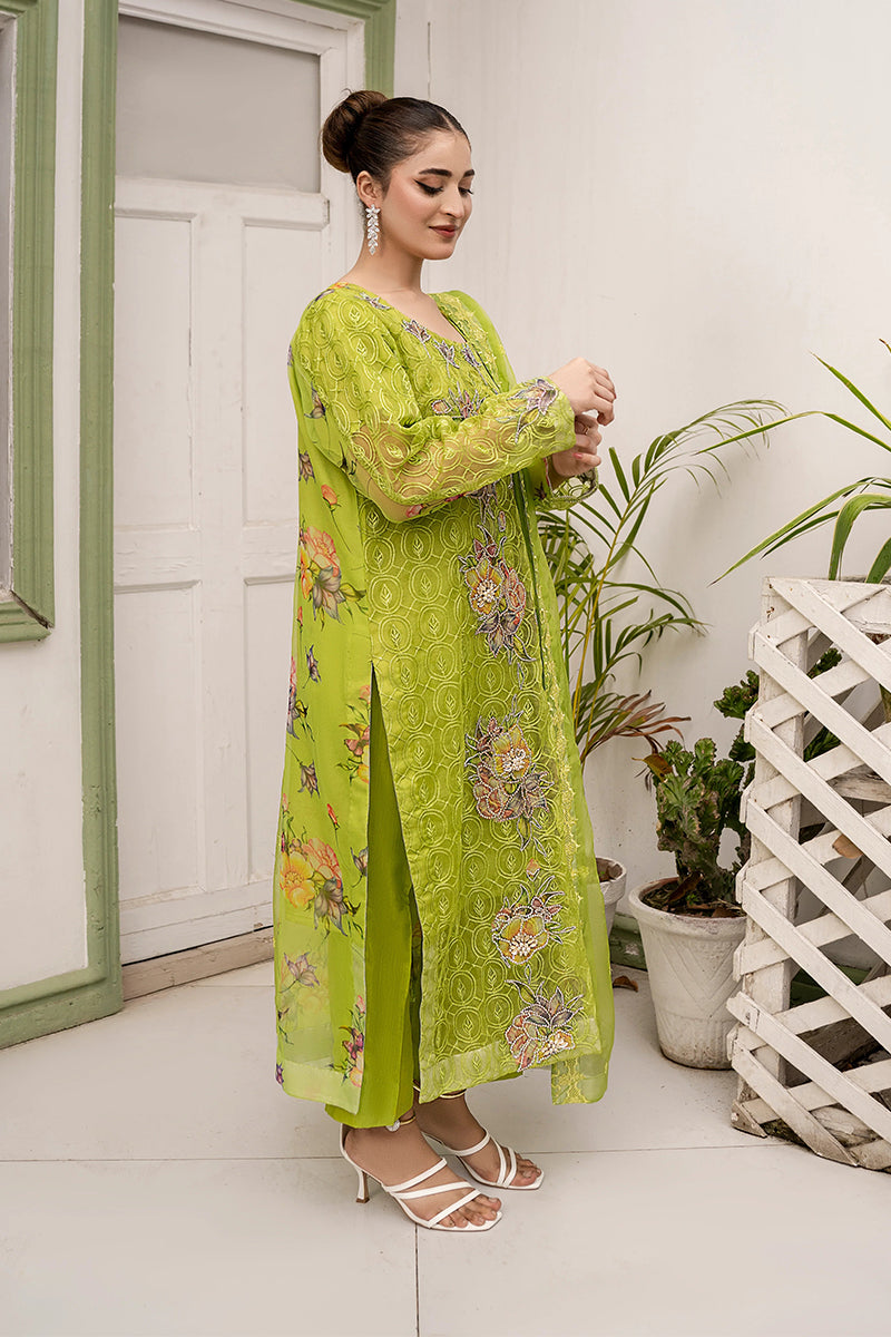 Experience the elegance of Nayab, a stunning 3-piece ensemble crafted from organza fabric with embossed shalwar. Designed to blend tradition with modern sophistication, this outfit features a long shirt with a beautifully handcrafted Chikankari front, adorned with delicate floral patches and stylish Nugh work. The printed back adds a contemporary charm, while the 4-side fusing organza dupatta completes the look with sheer grace.