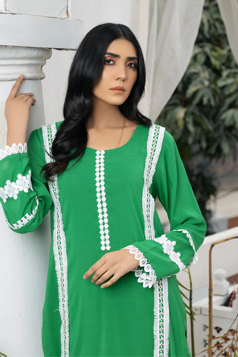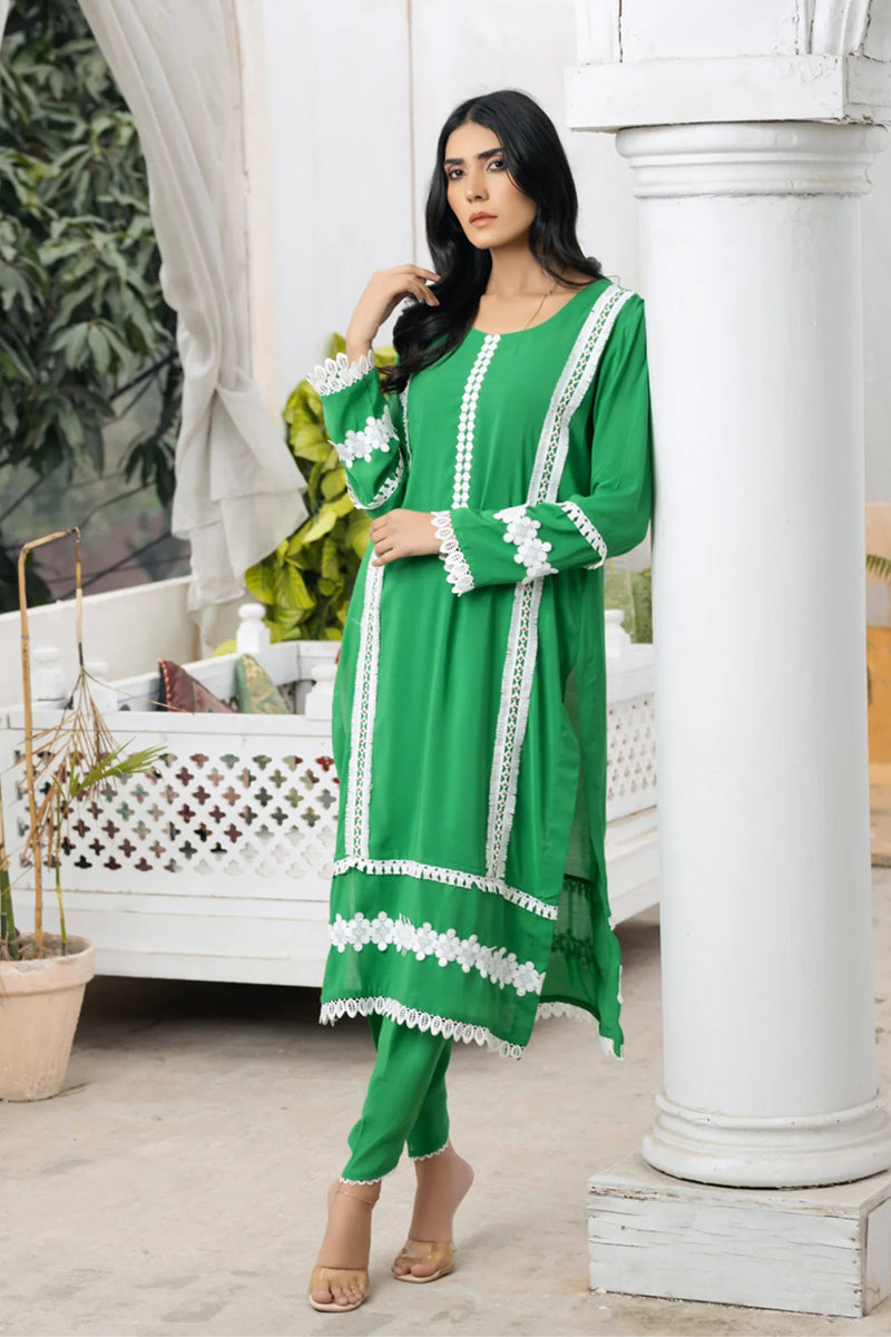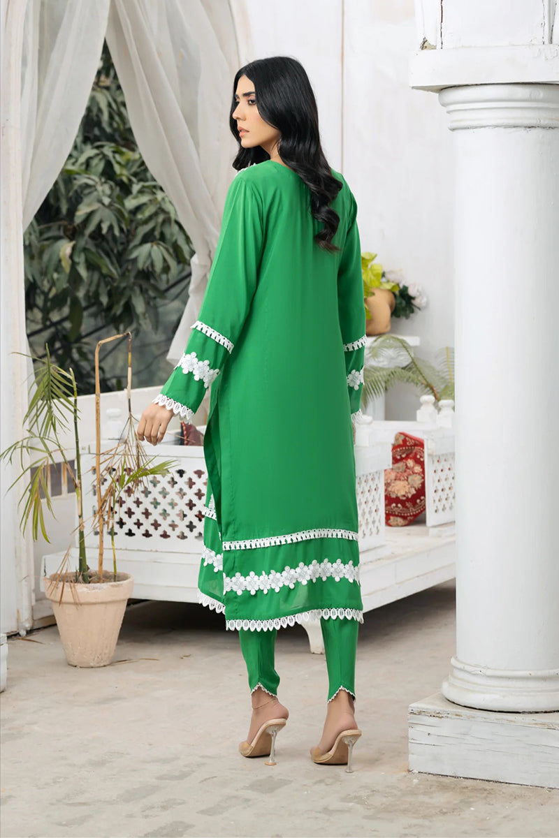 The front side of the shirt is embellished with two types of laces, and the backside of the daman also features lace adornments. Lace embellishments are present on the shirt's wrists. A single lace adorns the bottom of the trouser.