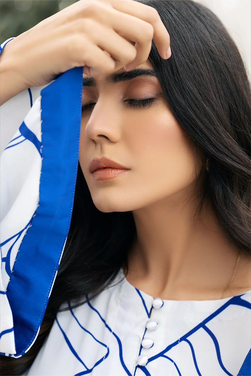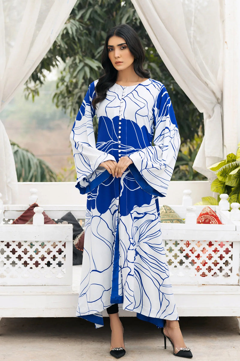t is an A-style shirt with a front open design. The neckline is embellished with buttons, and the shirt's wrists are styled with a broad open round. The front, back, daman, and side chalks are hemmed with a matching patch of shamooz silk.