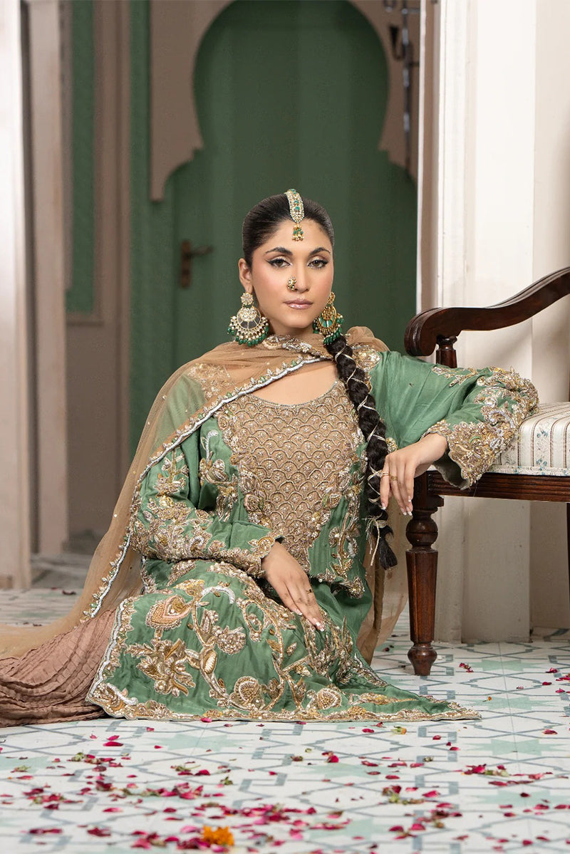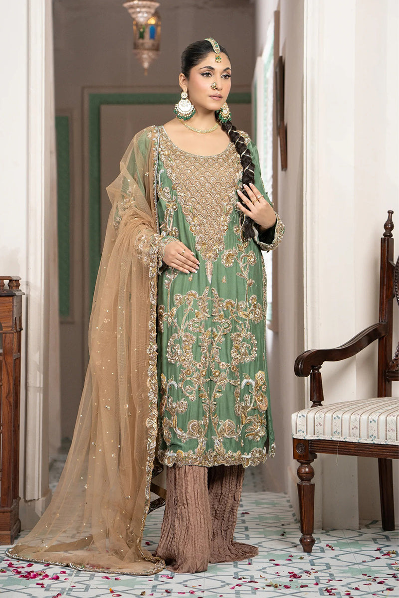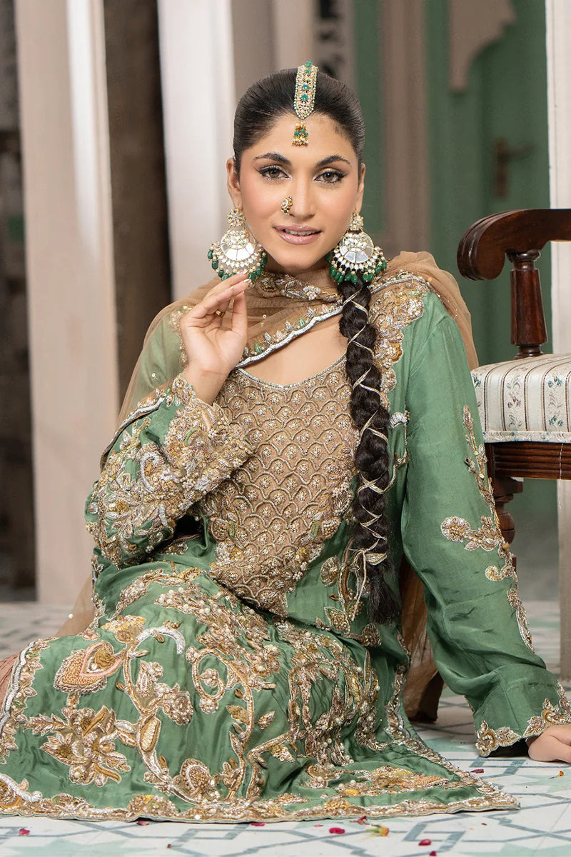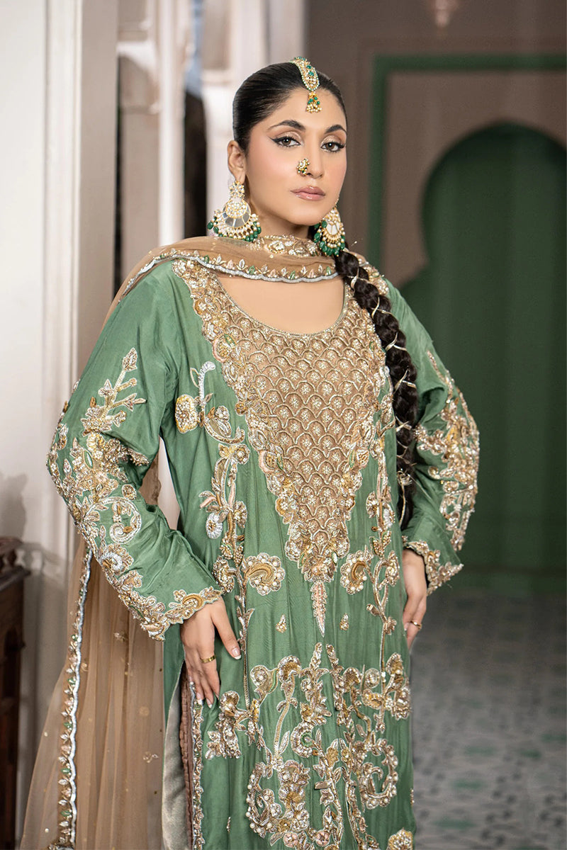 Radiate elegance in this antique green formal suit. The long, straight-cut kameez is a masterpiece of craftsmanship, with intricate and colorful floral embroidery and sparkling embellishments covering the entire front and sleeves. Paired with a stylish silk trouser and a matching dupatta, this luxurious and elegant formal suit is a perfect choice for high-end events.