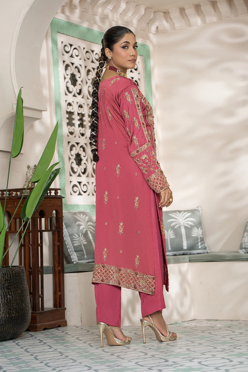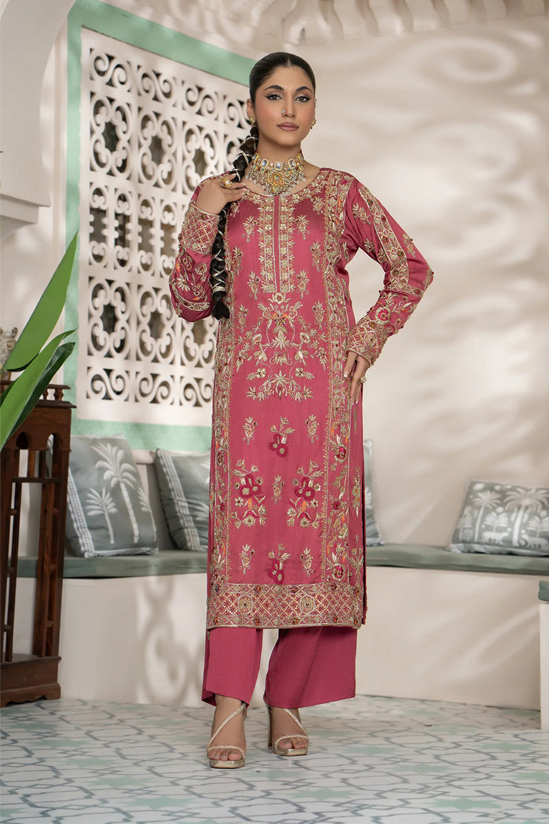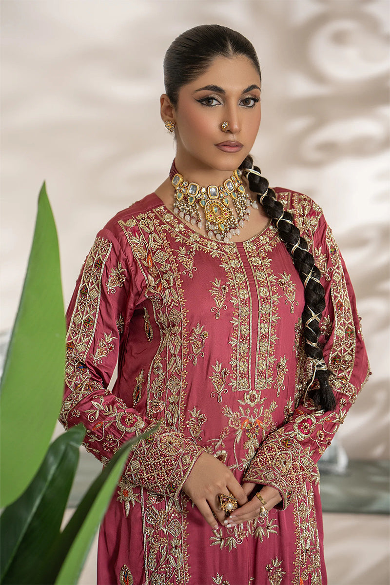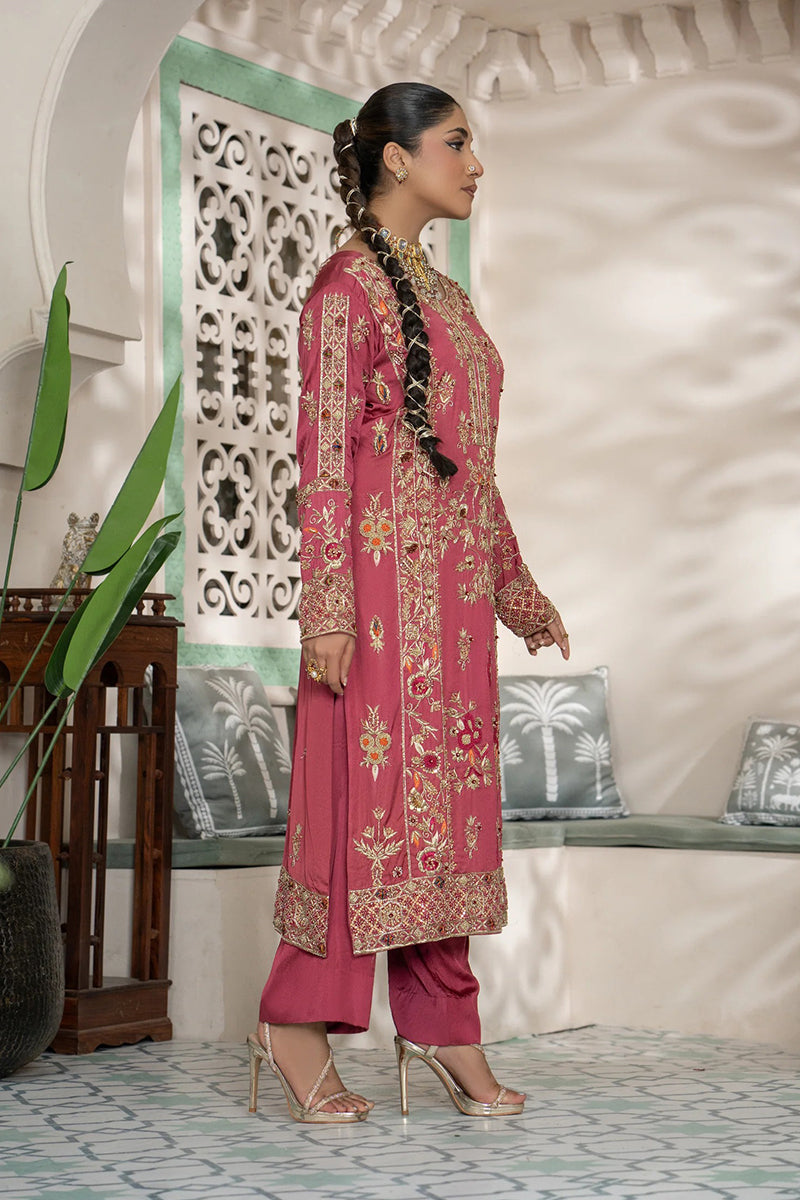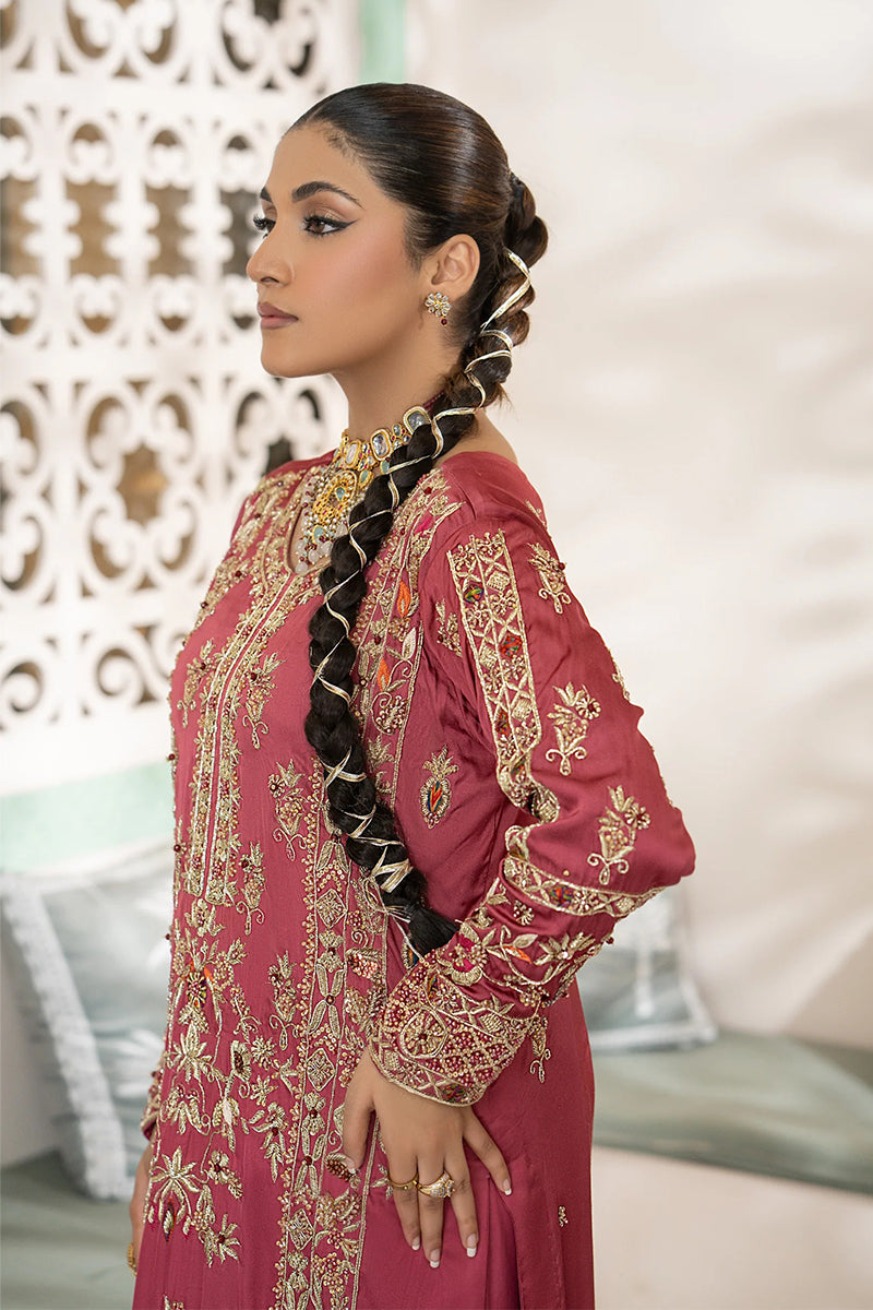Embrace timeless grace with this stunning antique rose silk suit. The long, embellished kameez is meticulously adorned with detailed embroidery and gold accents, creating a regal and elegant look. Paired with a stylish silk trouser and a matching dupatta, this luxurious ensemble is designed for sophistication and comfort, making it a perfect choice for special occasions and formal gatherings.