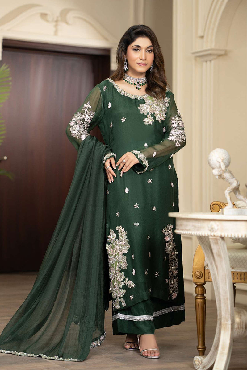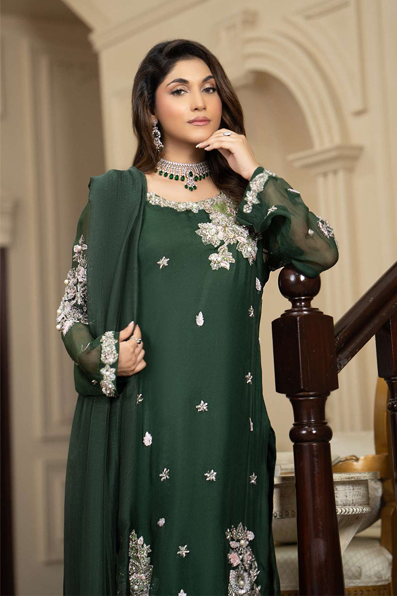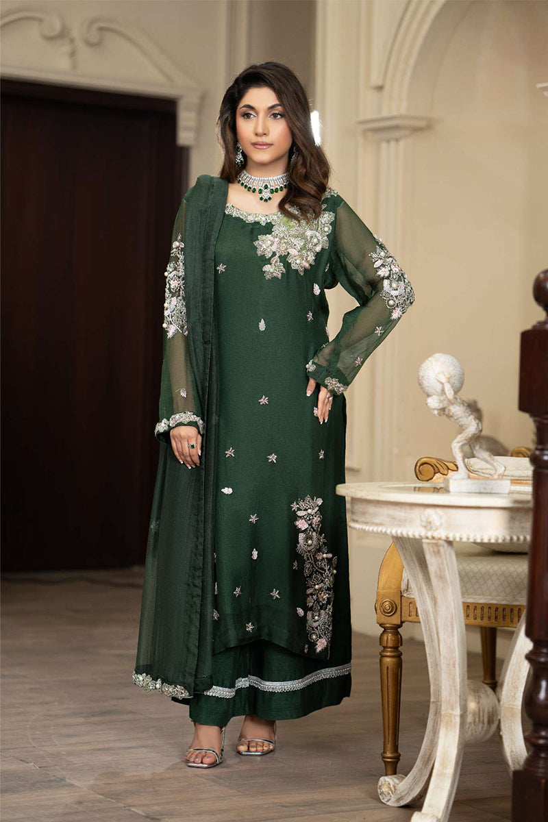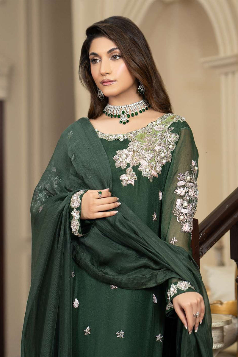 Evoke timeless sophistication with this stunning forest green formal suit. Crafted from luxurious chiffon, the kameez is exquisitely adorned with delicate embroidery and sparkling embellishments, creating an aura of opulence. Paired with a matching plain trouser and a beautifully embroidered dupatta, this elegant three-piece ensemble is perfect for formal events and luxury occasions.