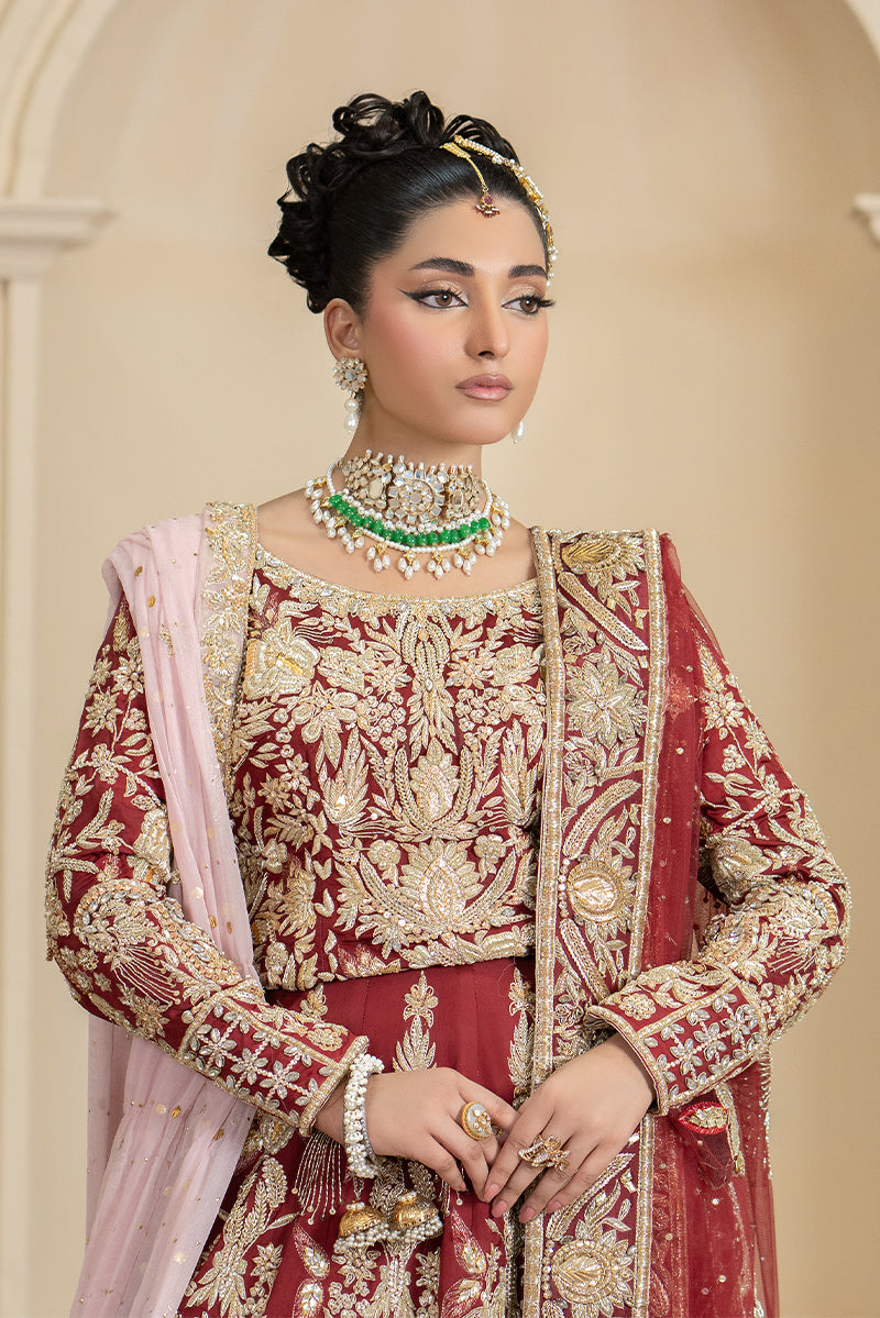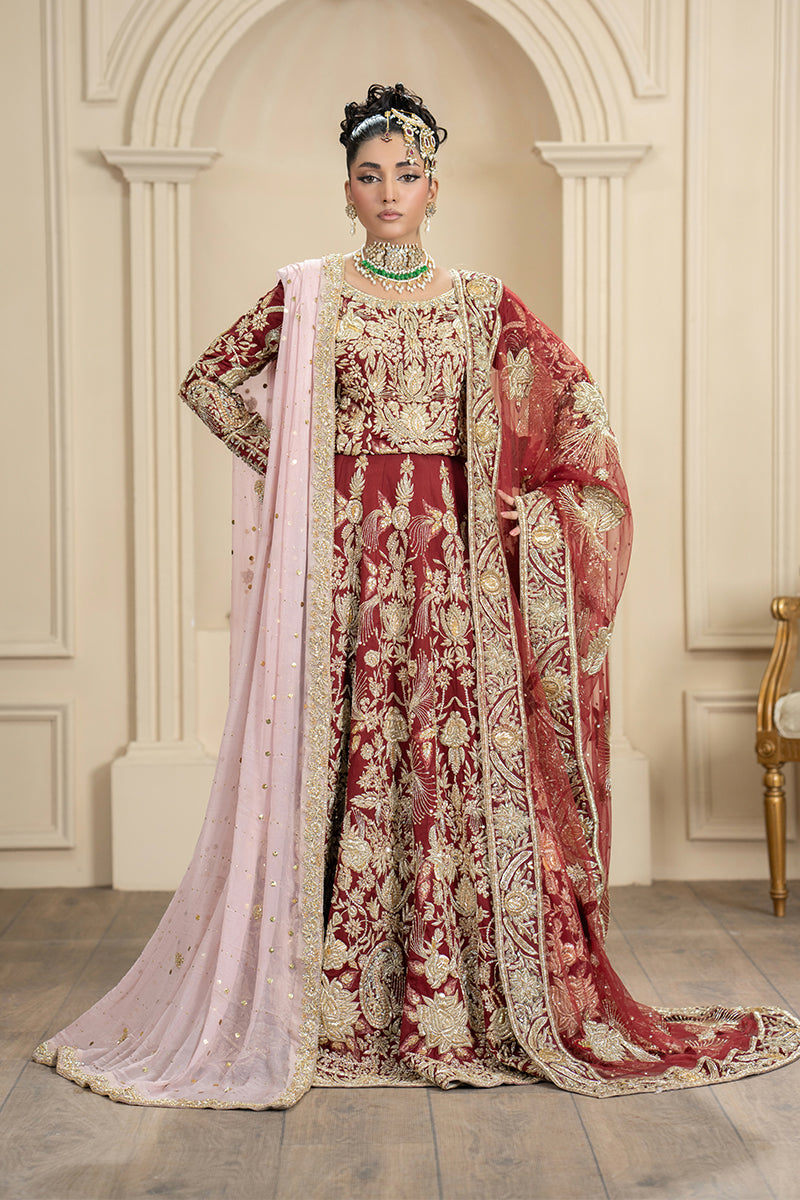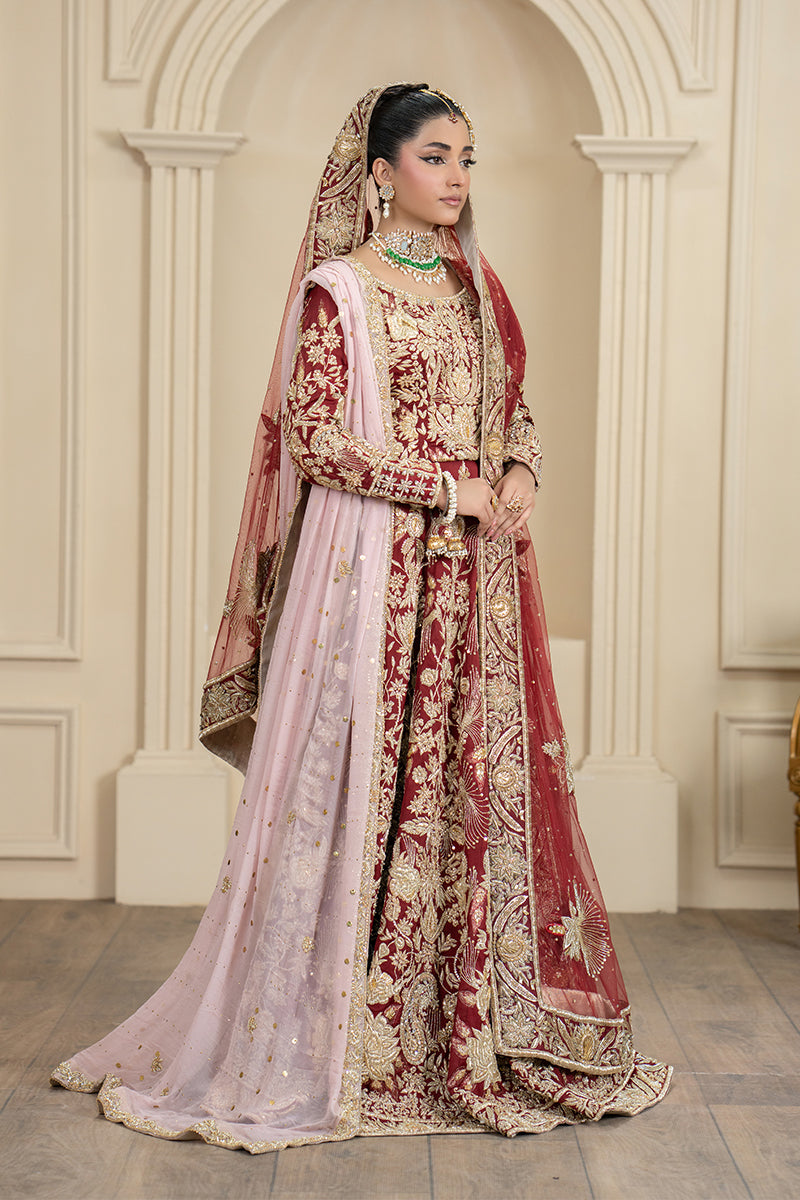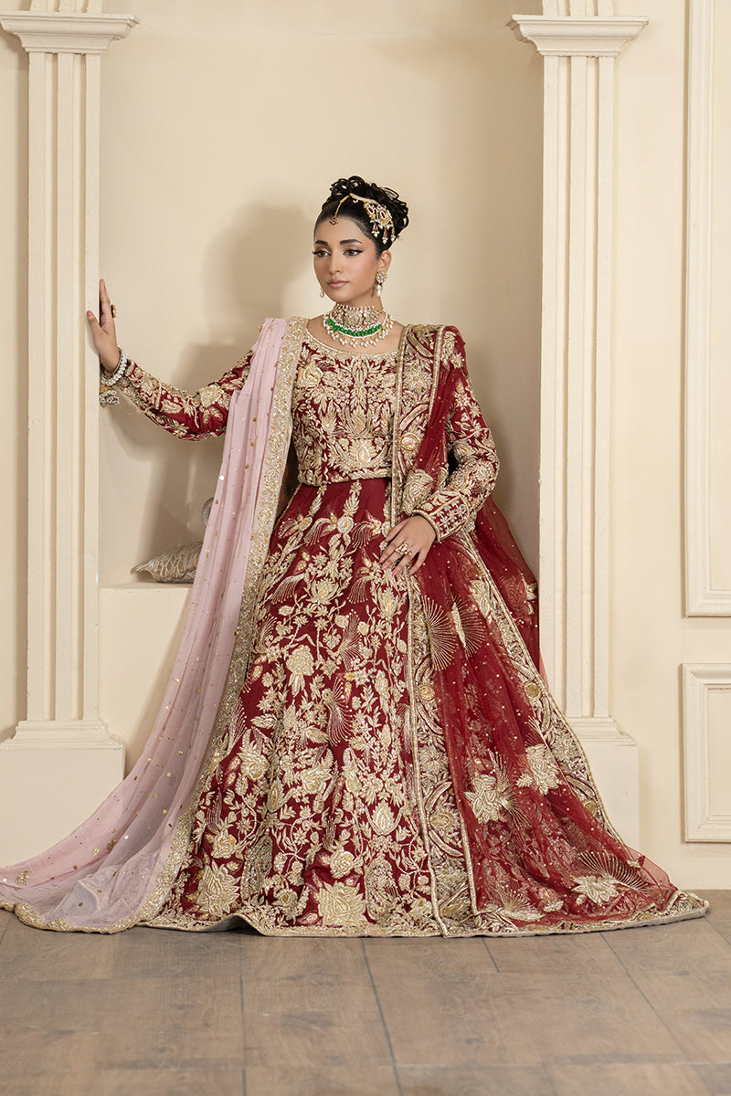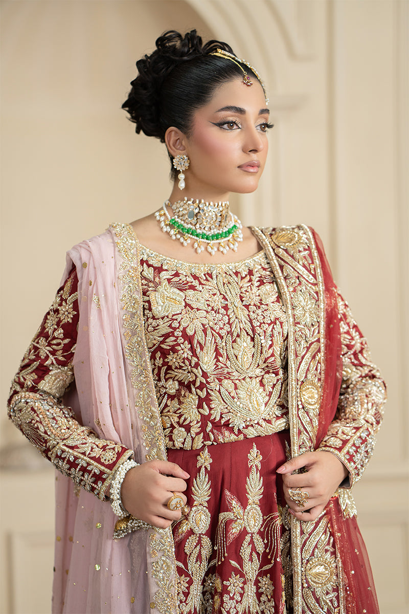 Step into a world of timeless luxury with this magnificent ruby red bridal gown. This flared gown is a masterpiece of traditional craftsmanship, with intricate golden embroidery, heavy embellishments, and stunning beadwork covering the entire silhouette. Paired with a delicate, light pink net dupatta and a second heavily embroidered dupatta, this elegant bridal wear is perfect for a grand wedding or formal ceremony.
