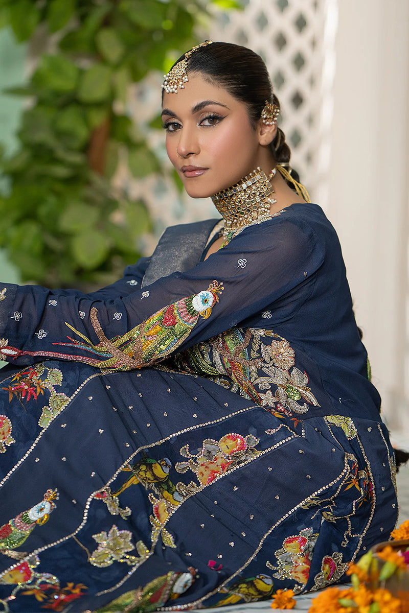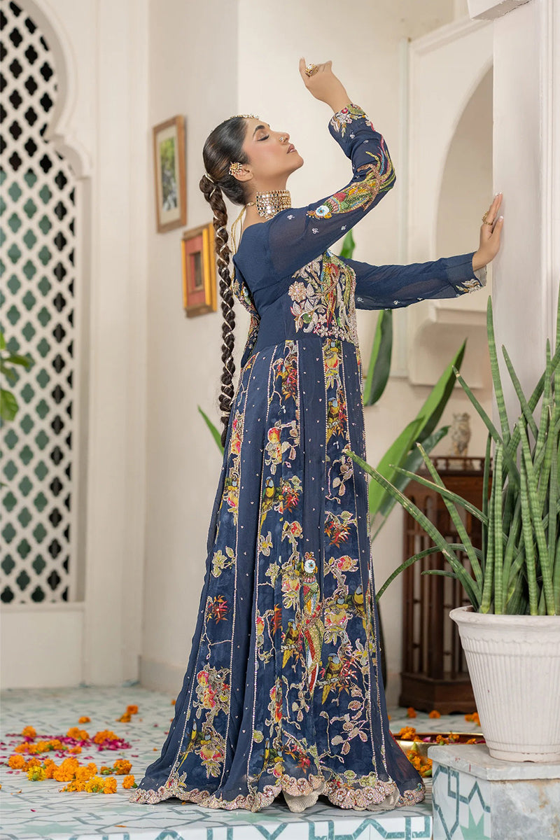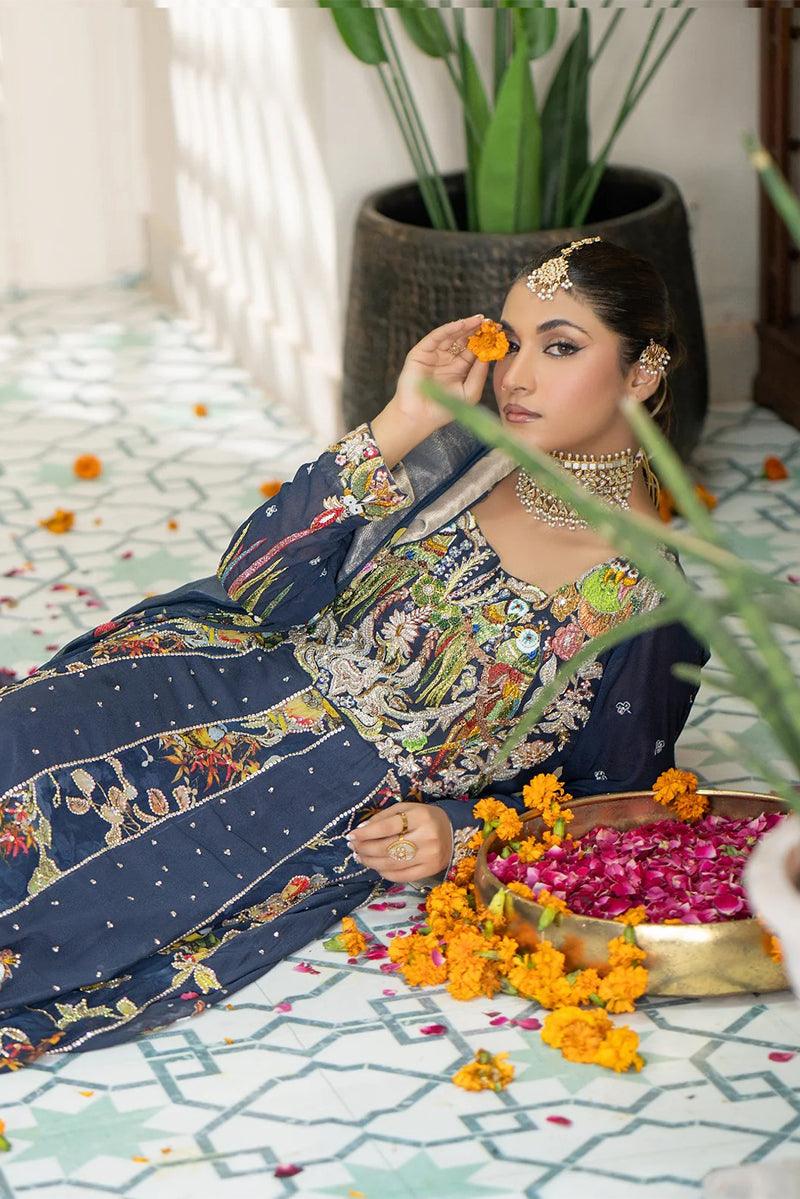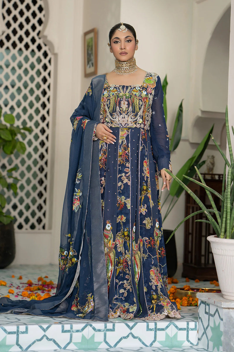 Step into a fairytale with this mesmerizing sapphire blue pishwas. Crafted from luxurious chiffon, the flared gown is a canvas for intricate and vibrant floral embroidery, creating a breathtaking, colorful design. Paired with a matching net dupatta, this ensemble features delicate sequins and ornate patterns that flow with every movement, making it a perfect choice for a grand formal event or wedding.