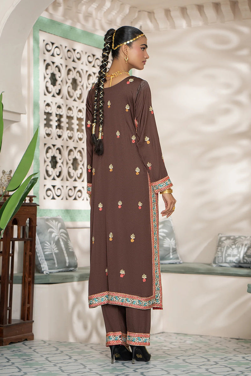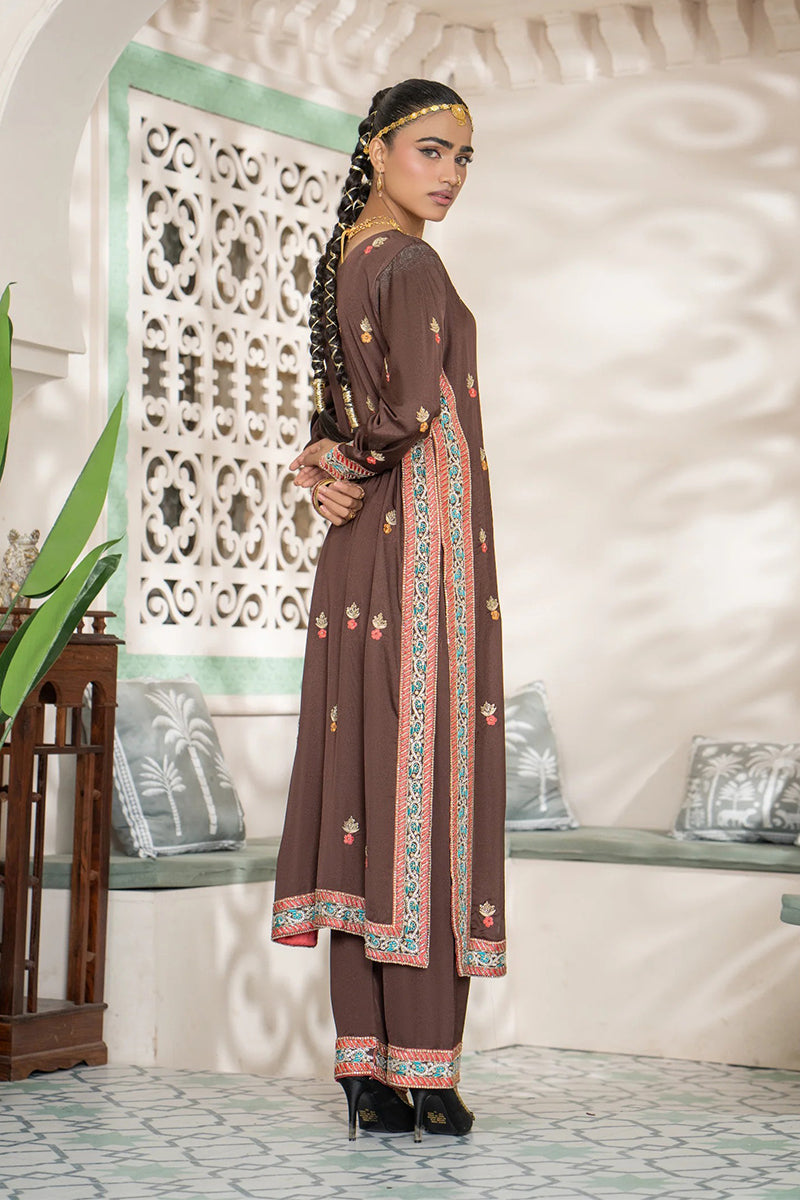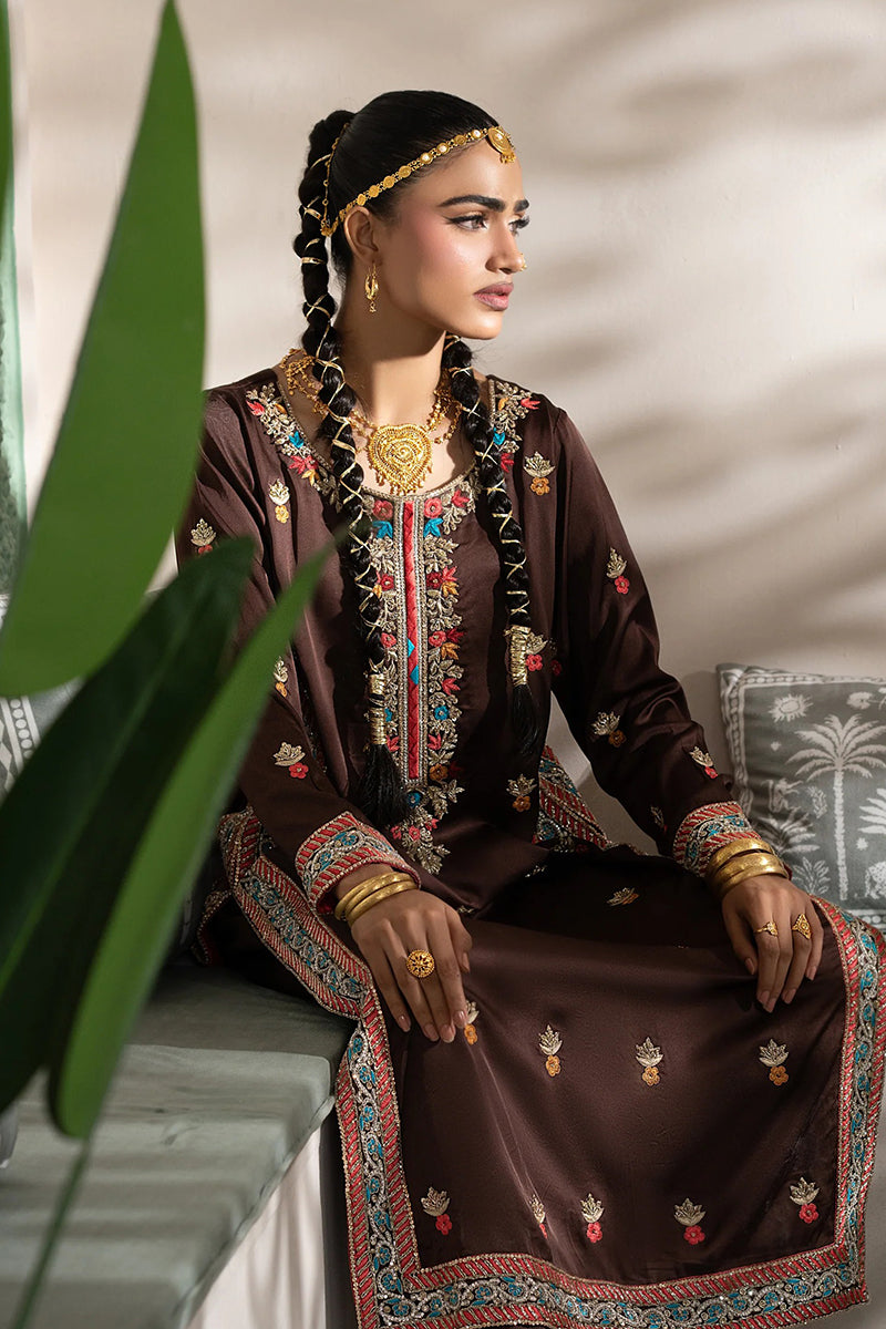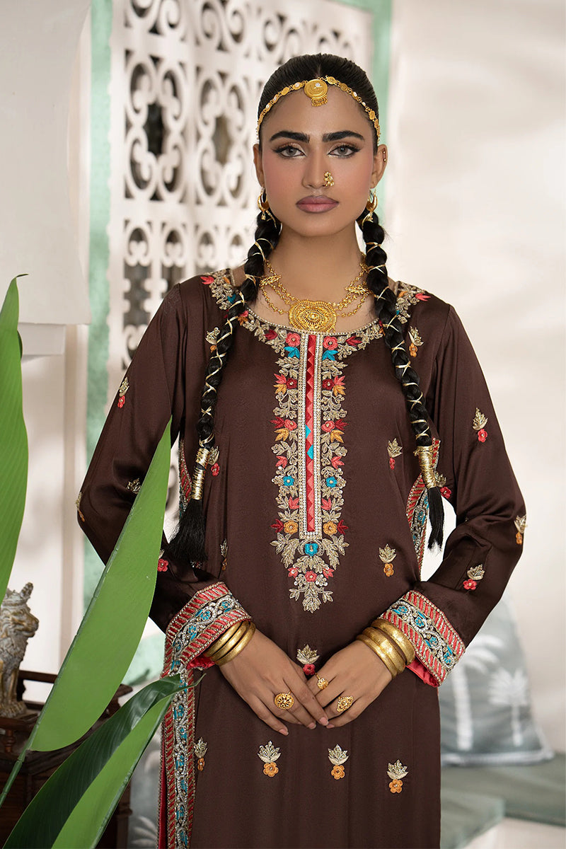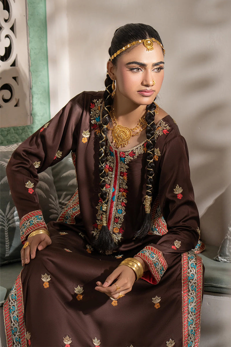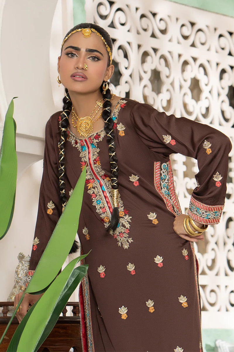 Embrace rich tradition with this beautiful sepia brown kurta set. The long, straight-cut kurta features intricate multi-colored embroidery and mirror work along the neckline and hem, creating a vibrant, cultural aesthetic. Paired with a matching trouser and a contrast red inner lining, this luxurious outfit is perfect for festive occasions, blending traditional charm with a modern silhouette.