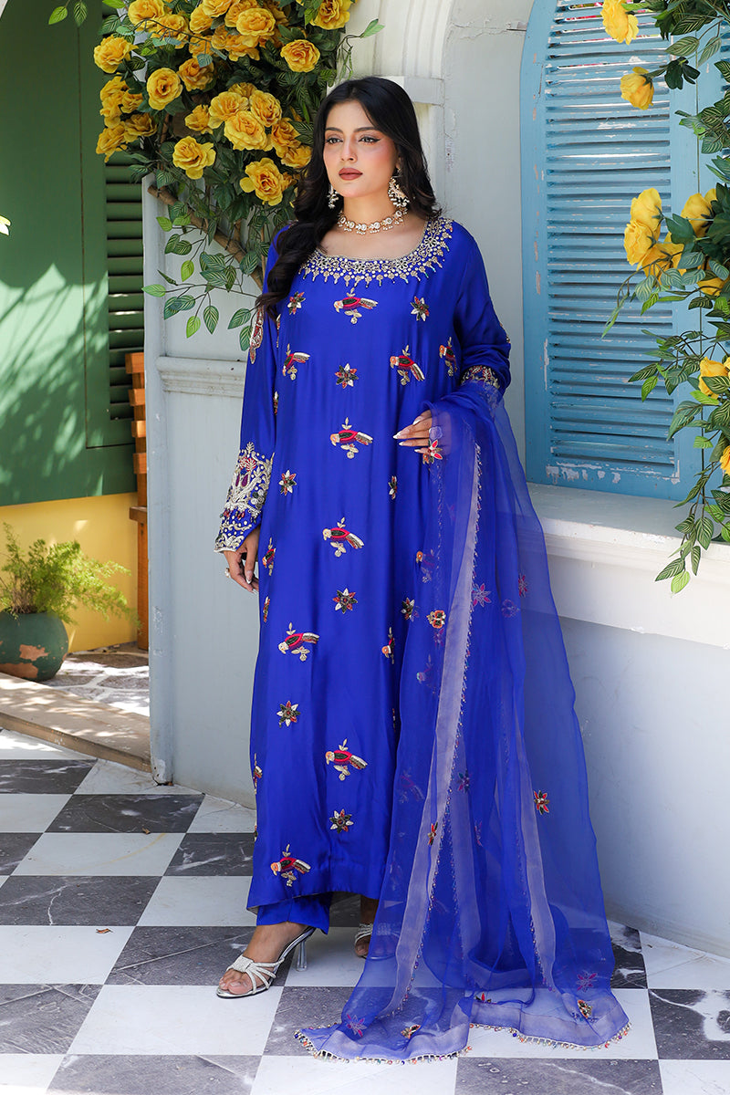 From our New Formals Collection comes a tribute to nature's most poetic muse: the bird. This 3-piece set (shirt + trouser + dupatta) is crafted in luxurious Tassle Silk – a fabric with subtle texture and a deep, midnight navy blue glow. The true magic lies on the shirt: handmade birds take flight across the fabric, each one brought to life with intricate sitara (star sequins), raised kora and dabka, luminous pearls, and delicate thread work. Every feather shimmers, every wing catches the light – a moving menagerie of artisan love.