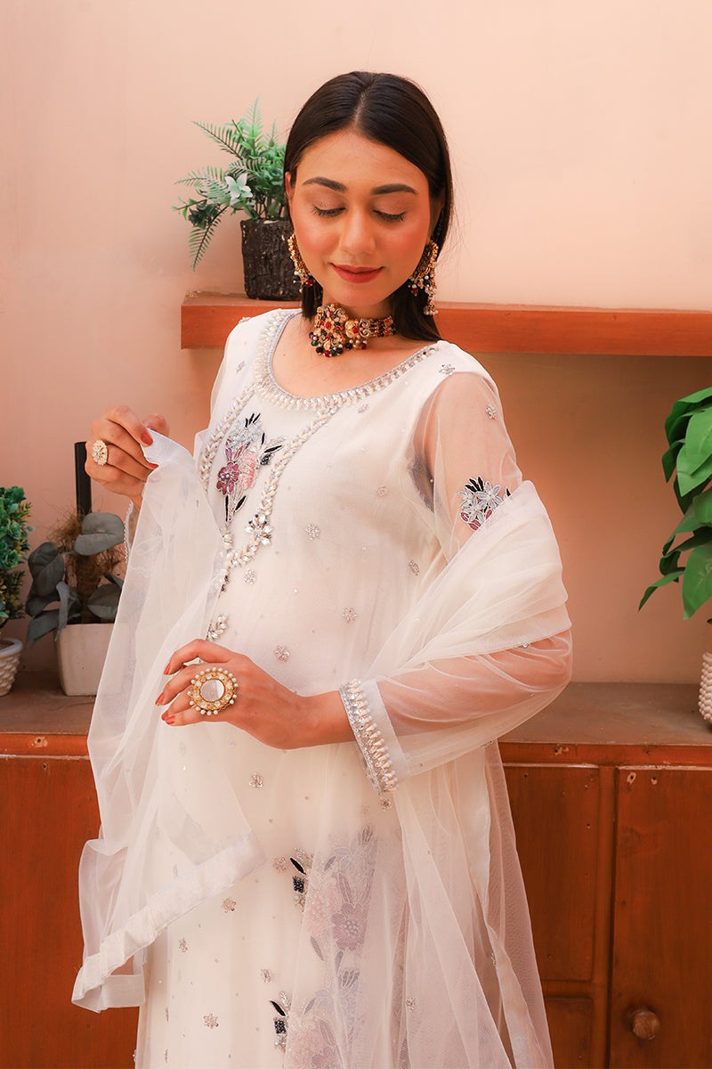 From our New Formals Collection comes a vision of untouched elegance: a 3-piece set (shirt + trouser + dupatta) in airy Net, bathed in pure white. The shirt is the heart of this masterpiece – entirely handmade, it carries layers of kora dabka, intricate jewellery work, and delicate resham thread embroidery. The white net acts as a translucent canvas, allowing every raised motif and jewel-like accent to float weightlessly against the skin. It is bridal wear that whispers purity while shouting craftsmanship.