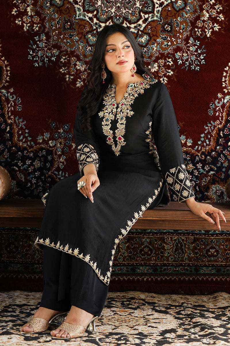 From our New Formals Collection comes a bold reimagining of bridal grandeur: a 3-piece set (shirt + trouser + dupatta) in black Tissue Silk – a fabric that shimmers like a moonlit sky. The deep black base makes every detail explode with drama. The shirt is entirely handmade, adorned with kora dabka that raises golden vines against the dark, twinkling sitara that scatter like constellations, and fluid thread work that adds poetic texture. Tissue silk catches every flicker of light, so you move through shadows and shine all at once.