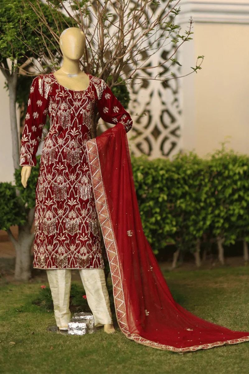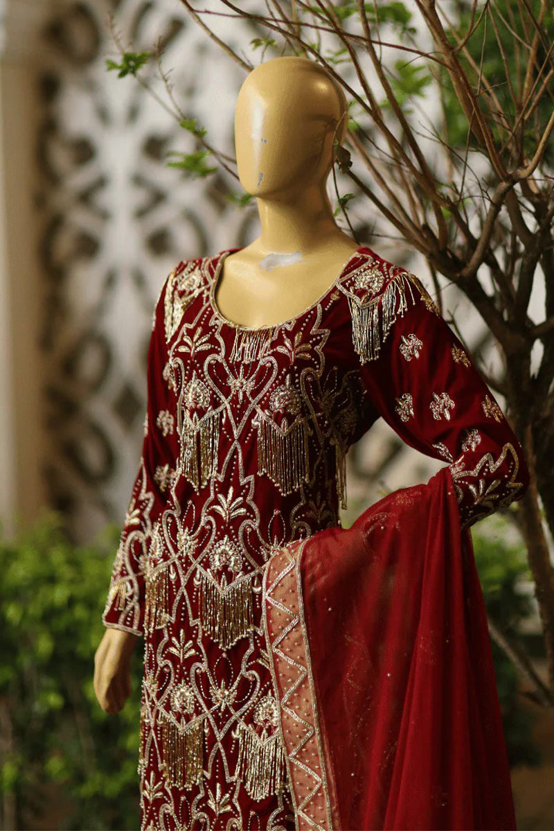 Introducing Amber, a breathtaking 3-piece ensemble crafted from pure velvet, featuring exquisite heavy pearl, Dabka, and Cut Dana handwork. Designed to exude elegance and sophistication, this luxurious attire is perfect for your most cherished occasions.