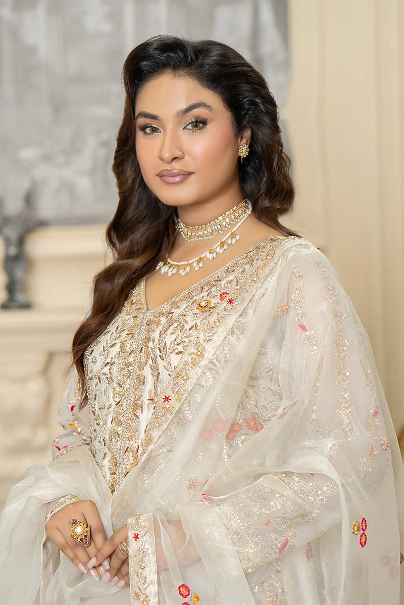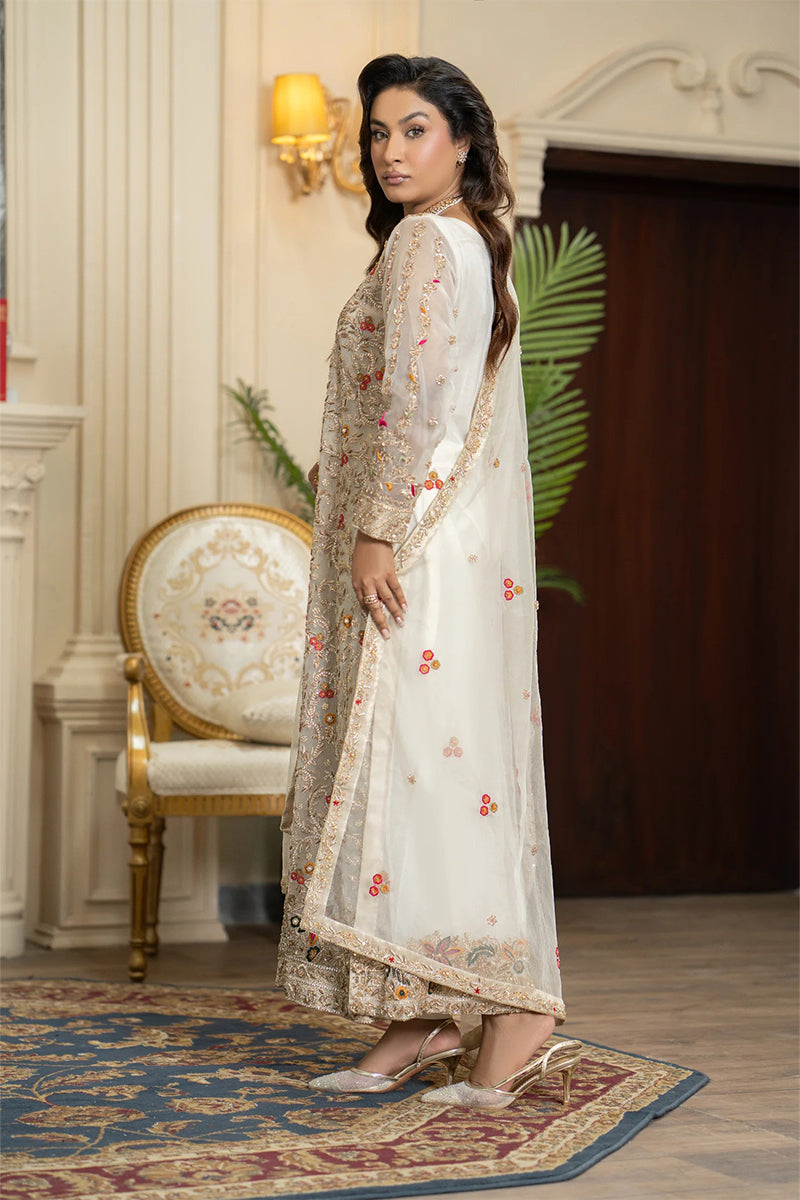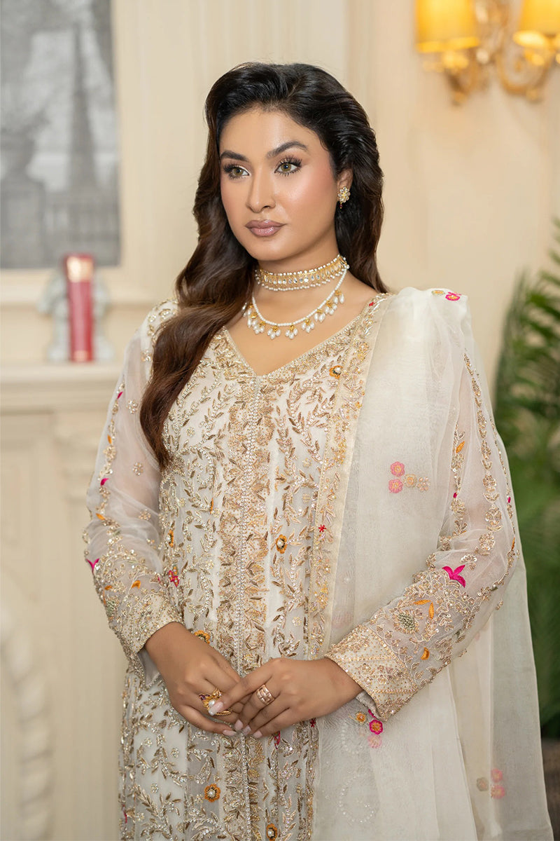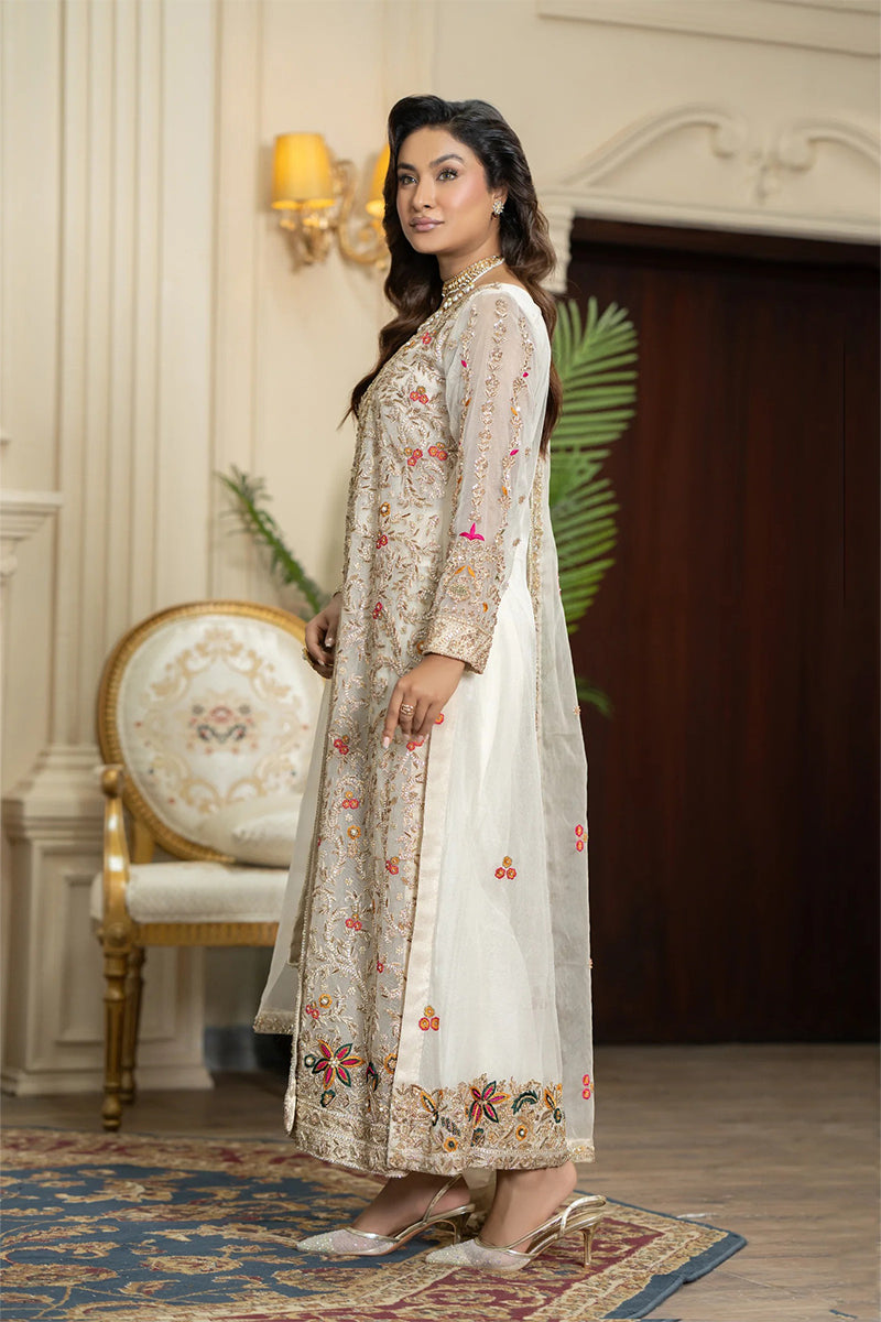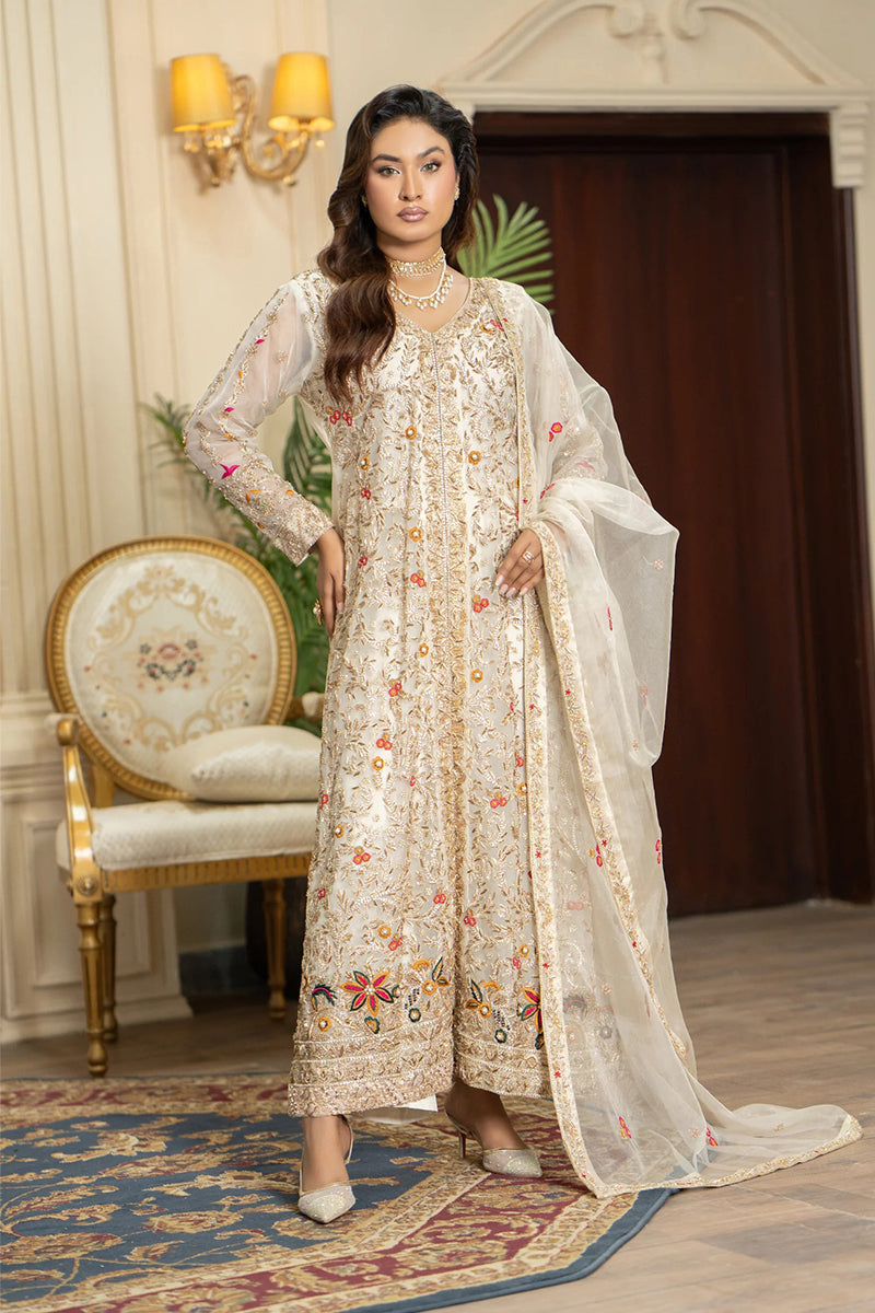 Radiate pure sophistication in this exquisite golden angrakha gown. The elegant, flowy silhouette is richly adorned with intricate floral embroidery in vibrant hues, creating a stunning and artistic design. Paired with a delicate organza dupatta featuring subtle embellishments, this luxurious outfit is the perfect choice for a high-end party or festive celebration.