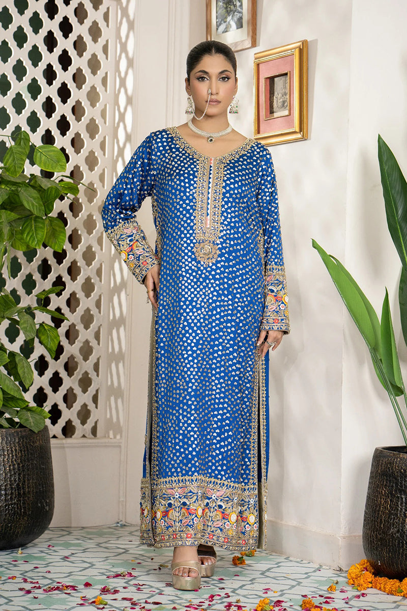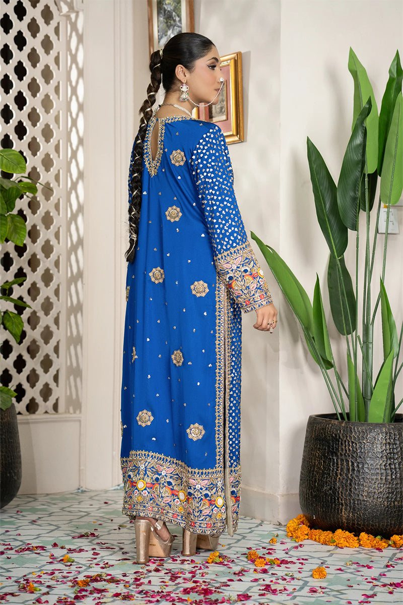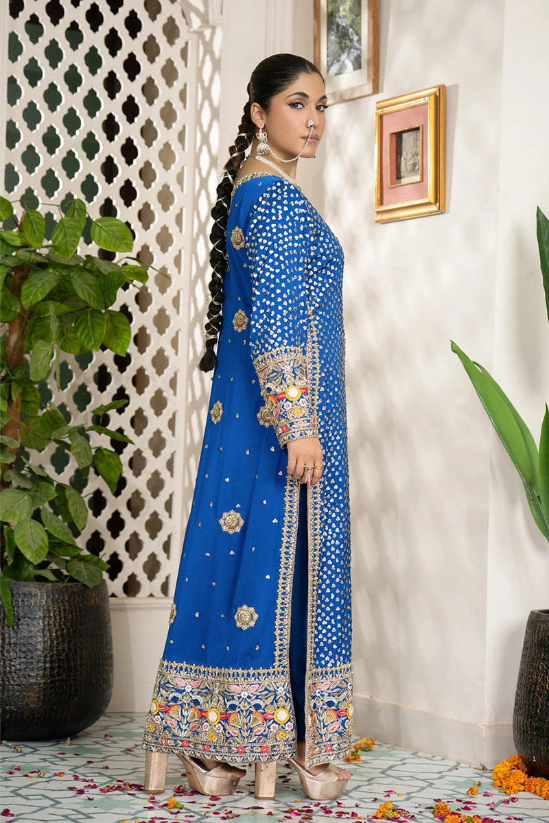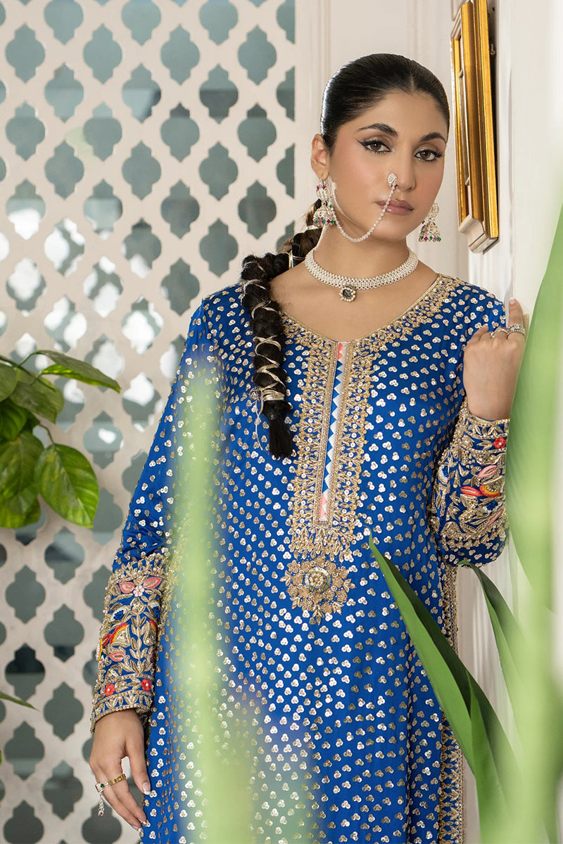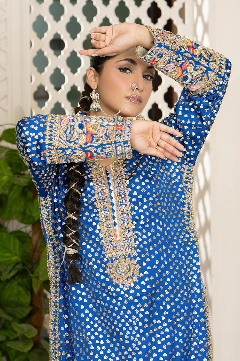 Experience the charm of tradition with ZarNeel, a royal blue silk outfit from our Made to Order Collection. Crafted with detailed hand embroidery and golden accents, this ensemble captures the essence of Pakistani elegance.