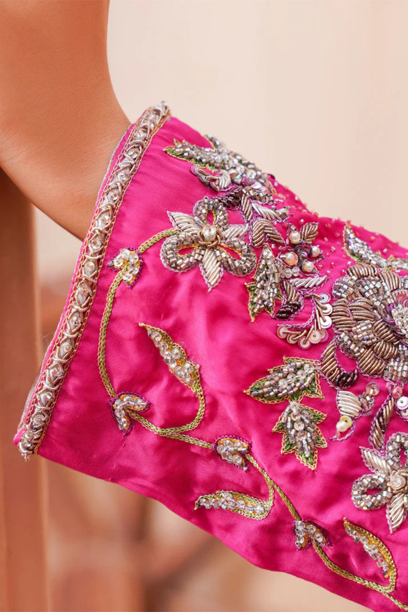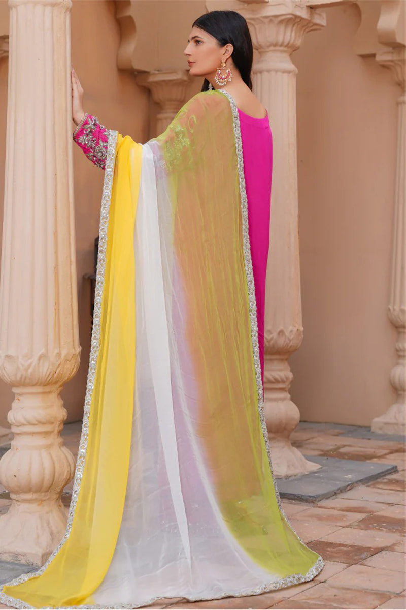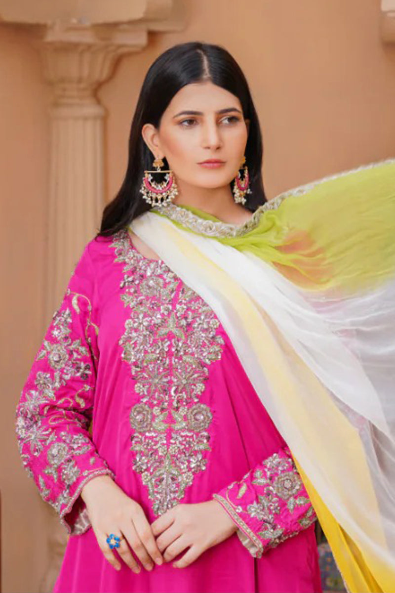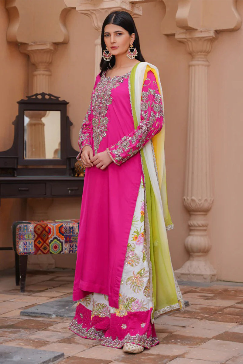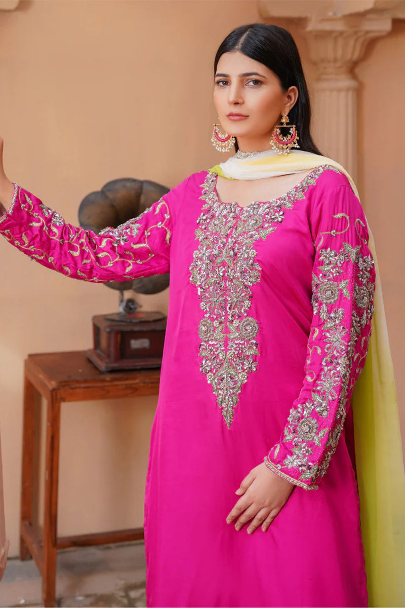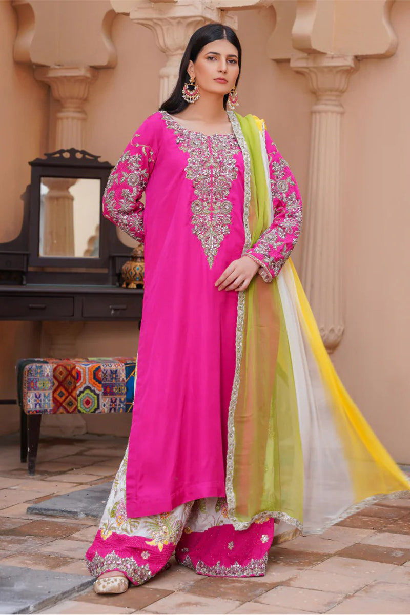 Exude elegance in our malaai silk three piece luxury formal dress, featuring a long shirt adorned with intricate handmade zardozi work, paired with a flowing palazzo. The outfit is complemented by a stunning three-shade dupatta with delicate lace, adding a touch of sophistication. This masterpiece is meticulously crafted with attention to detail, making it perfect for special occasions and formal events.