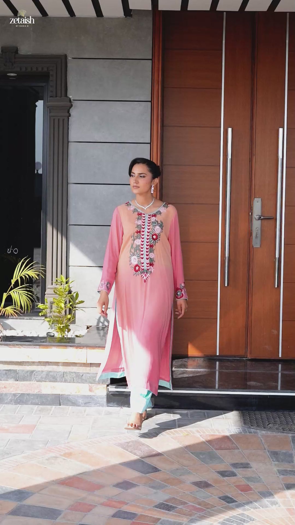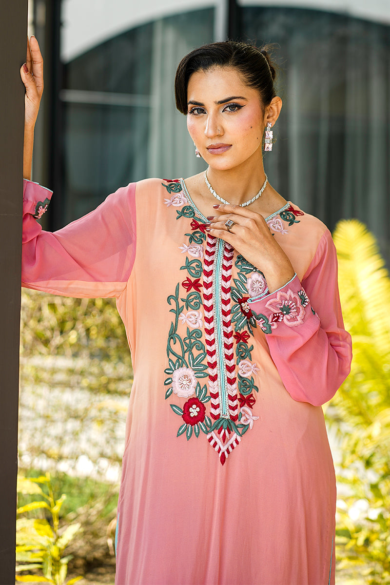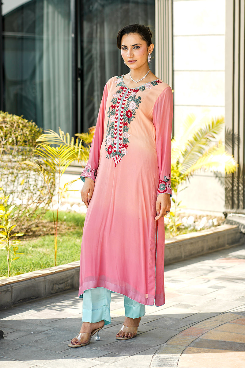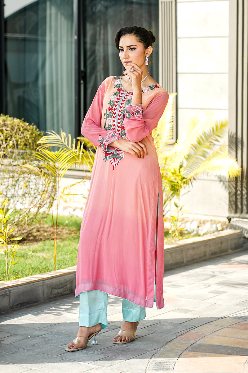 Chic 2-piece party wear suit adorned with vibrant floral embroidery and a soft, graceful drape.Paired with matching trousers for a fresh, elegant look perfect for festive gatherings.