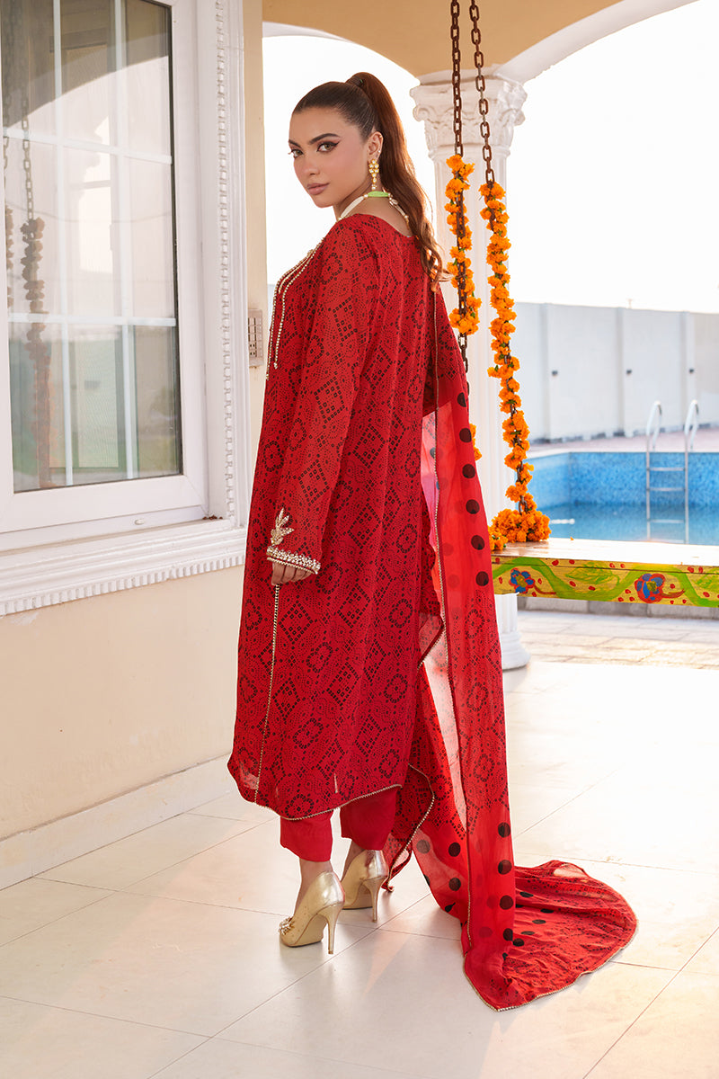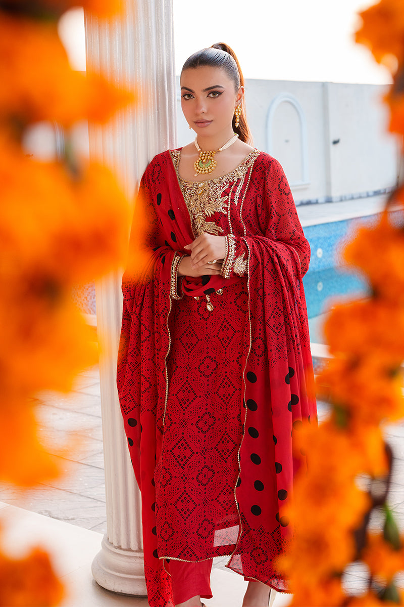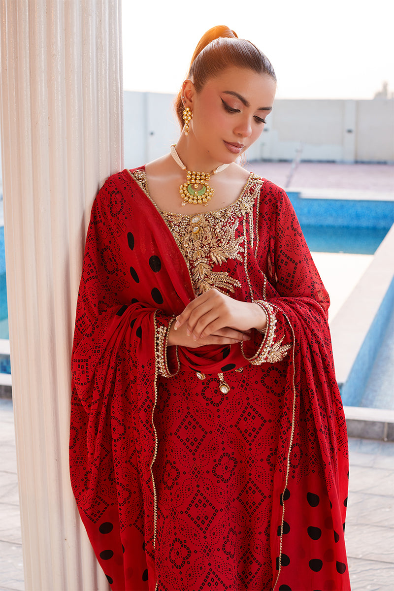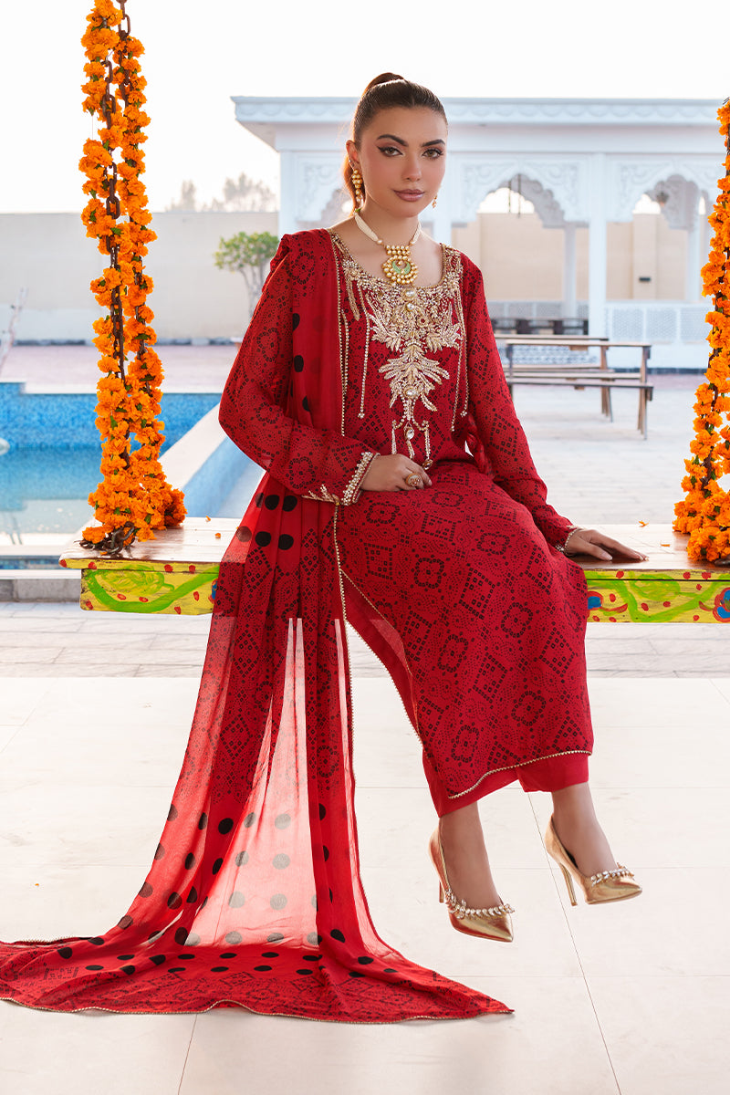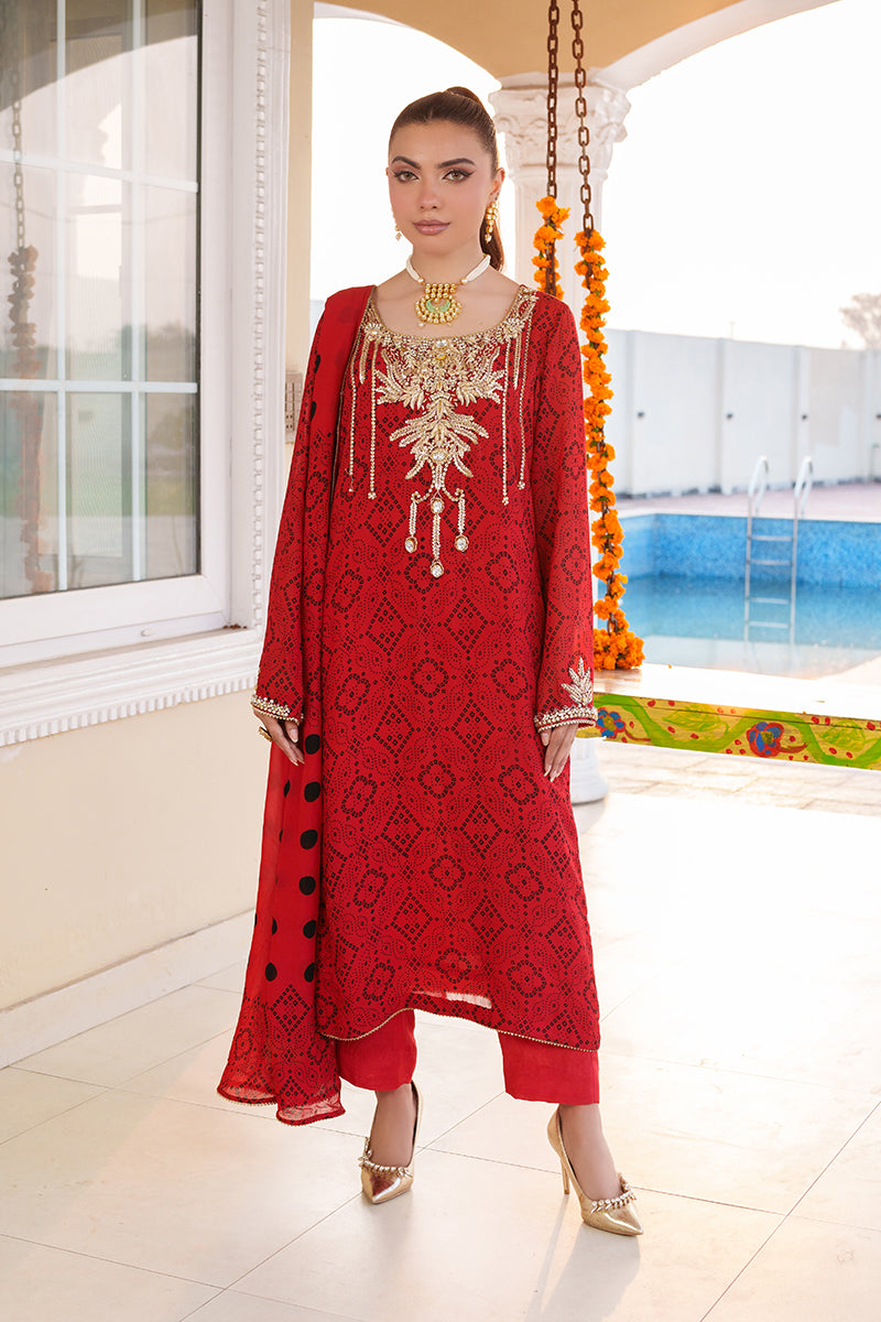 This 3-piece chunri chiffon suit is designed for the woman who commands attention with elegance. The shirt features handmade artistry, combining dabka, naqshi, tilla work, and delicate lace accents, creating a rich tapestry of texture and shimmer. Each detail is carefully crafted to bring out the festive spirit and timeless charm of the outfit.
