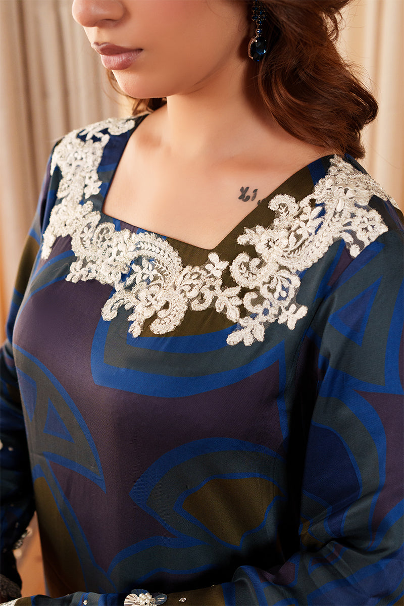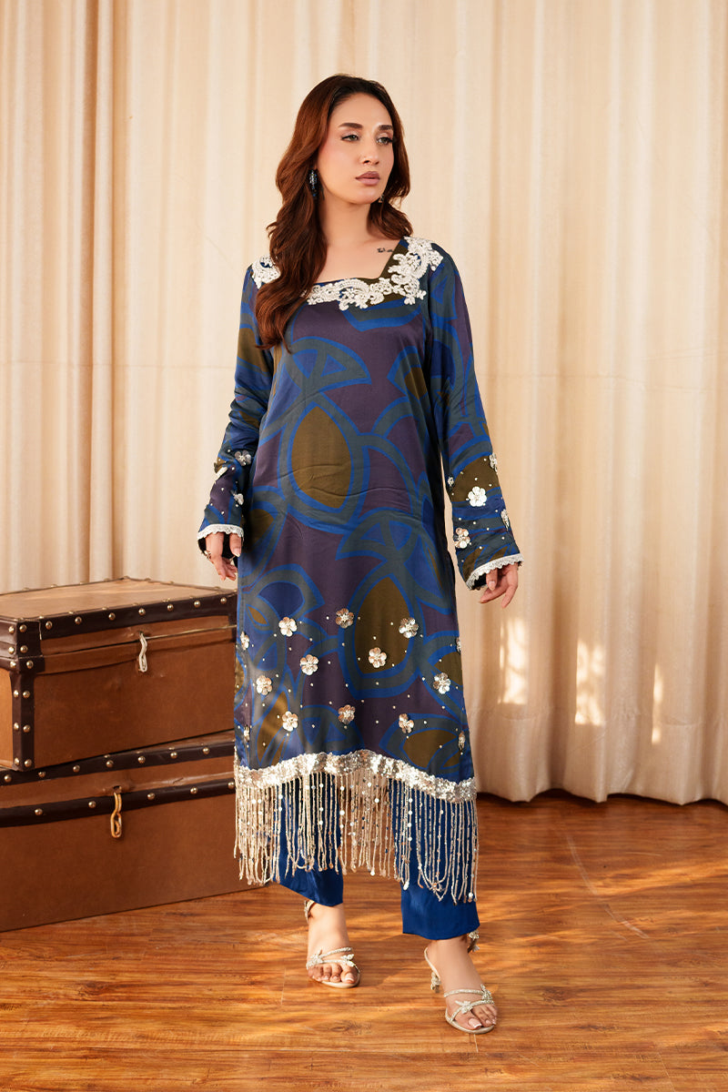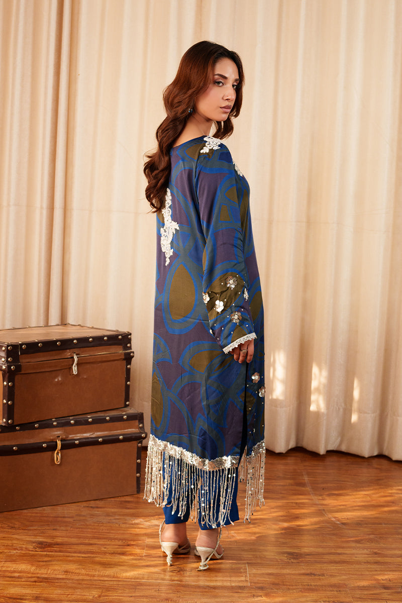 Tailored in luxe printed silk, this two-piece ensemble brings together statement artistry and wearable elegance. The shirt is beautifully adorned with handmade sitara and moti embellishments, thoughtfully layered with delicate lace trims and contemporary patchwork detailing — creating texture, depth, and subtle shimmer in every movement.