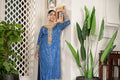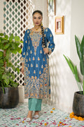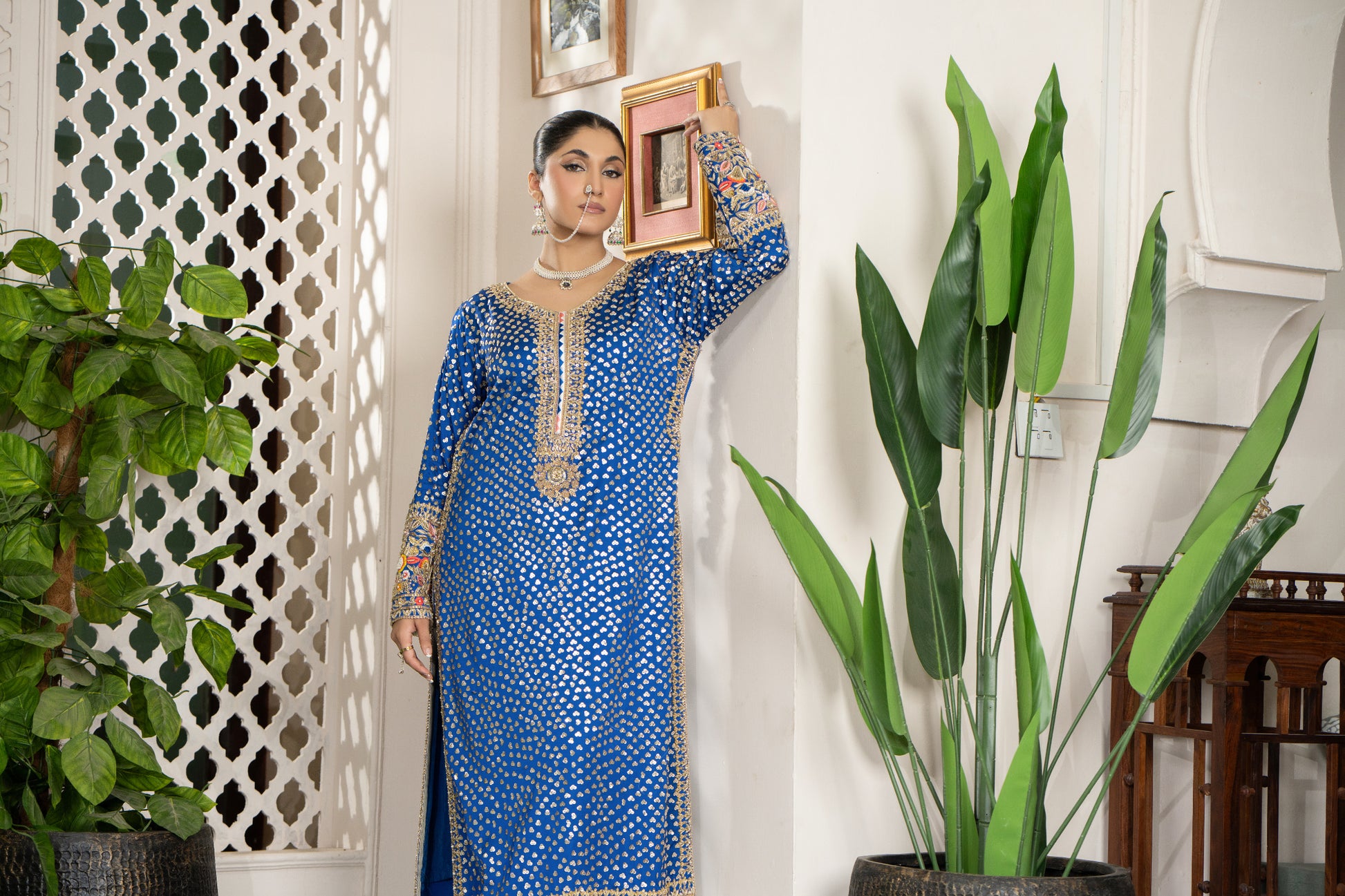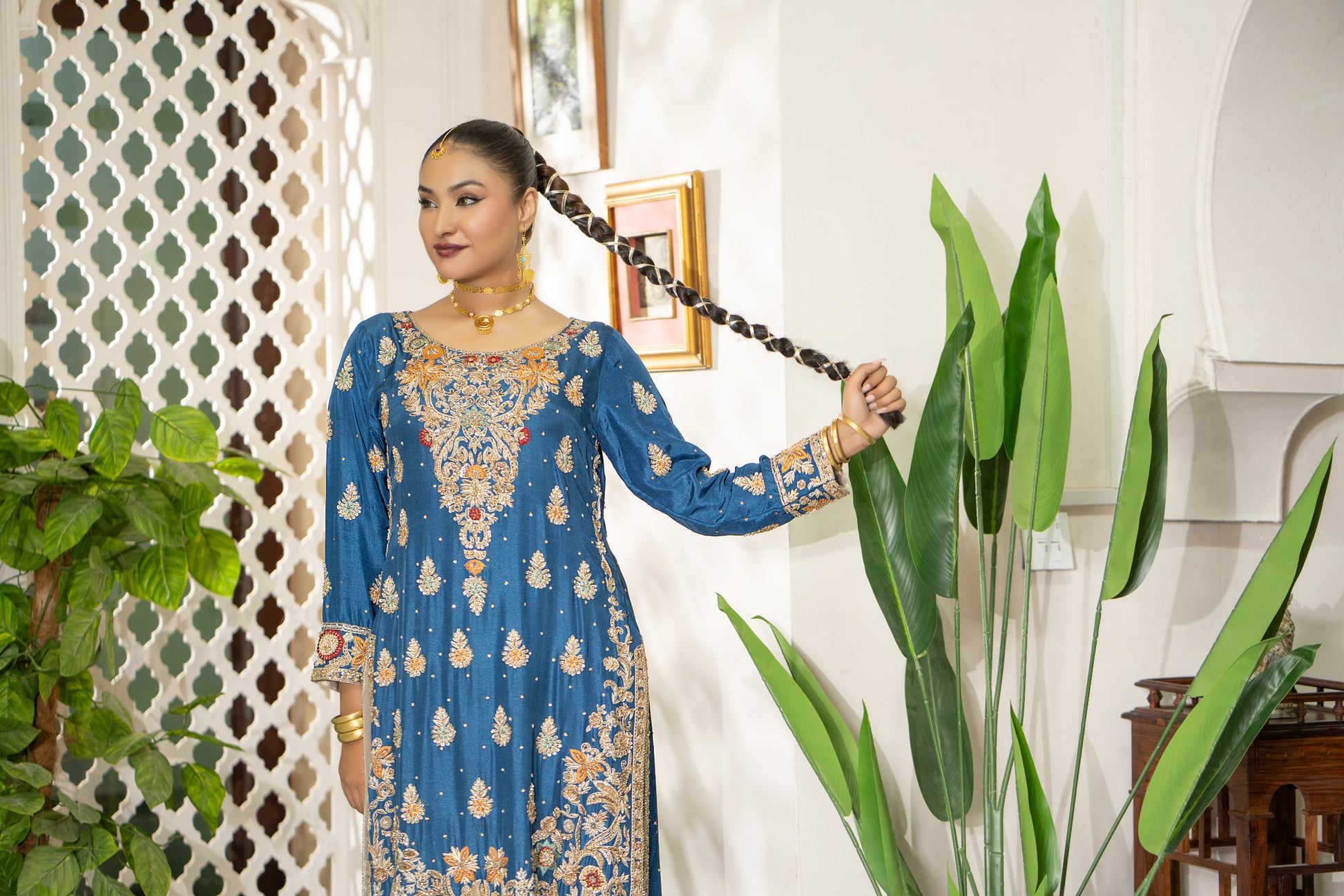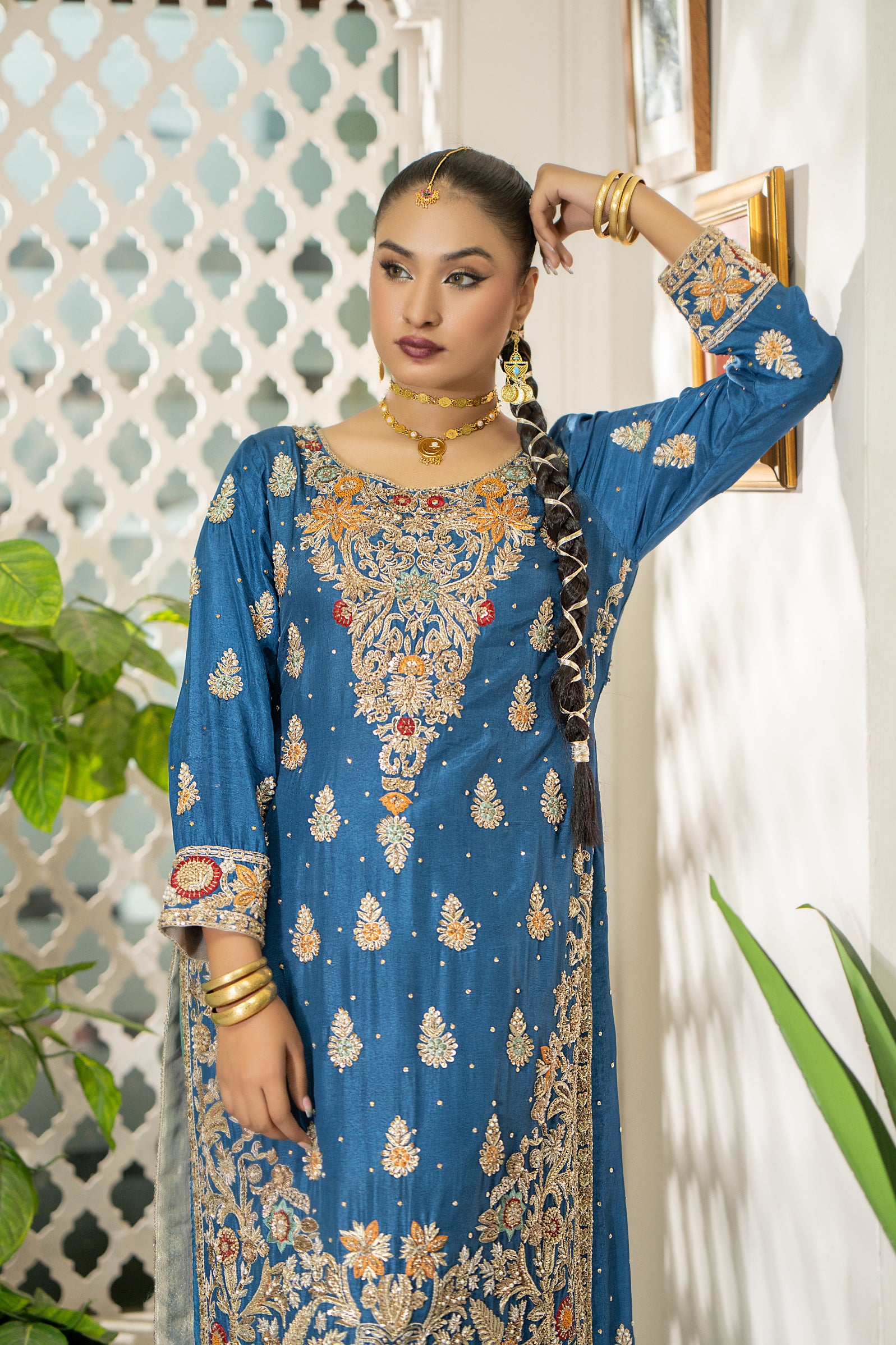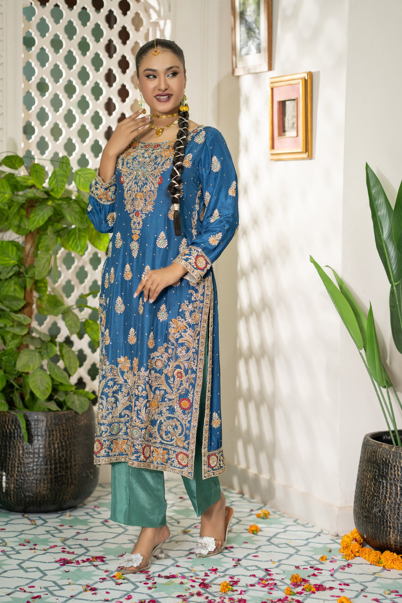 Make a regal impression in this celestial blue silk suit. The long, straight-cut kameez is a masterpiece of craftsmanship, with intricate and colorful floral embroidery and sparkling embellishments covering the entire front and sleeves. Paired with a stylish silk trouser and a matching dupatta, this luxurious and elegant formal suit is a perfect choice for high-end events.