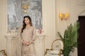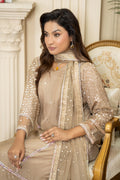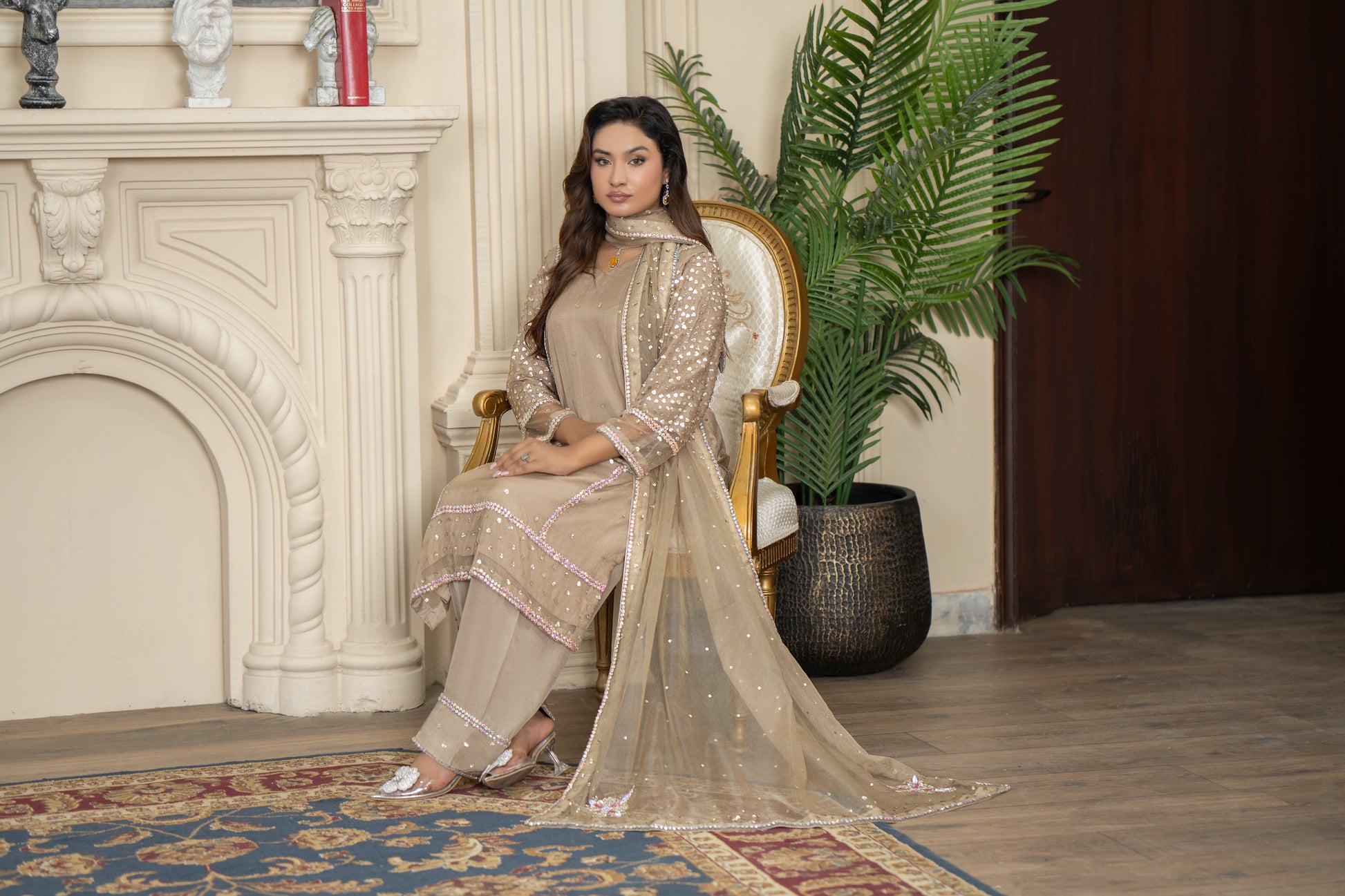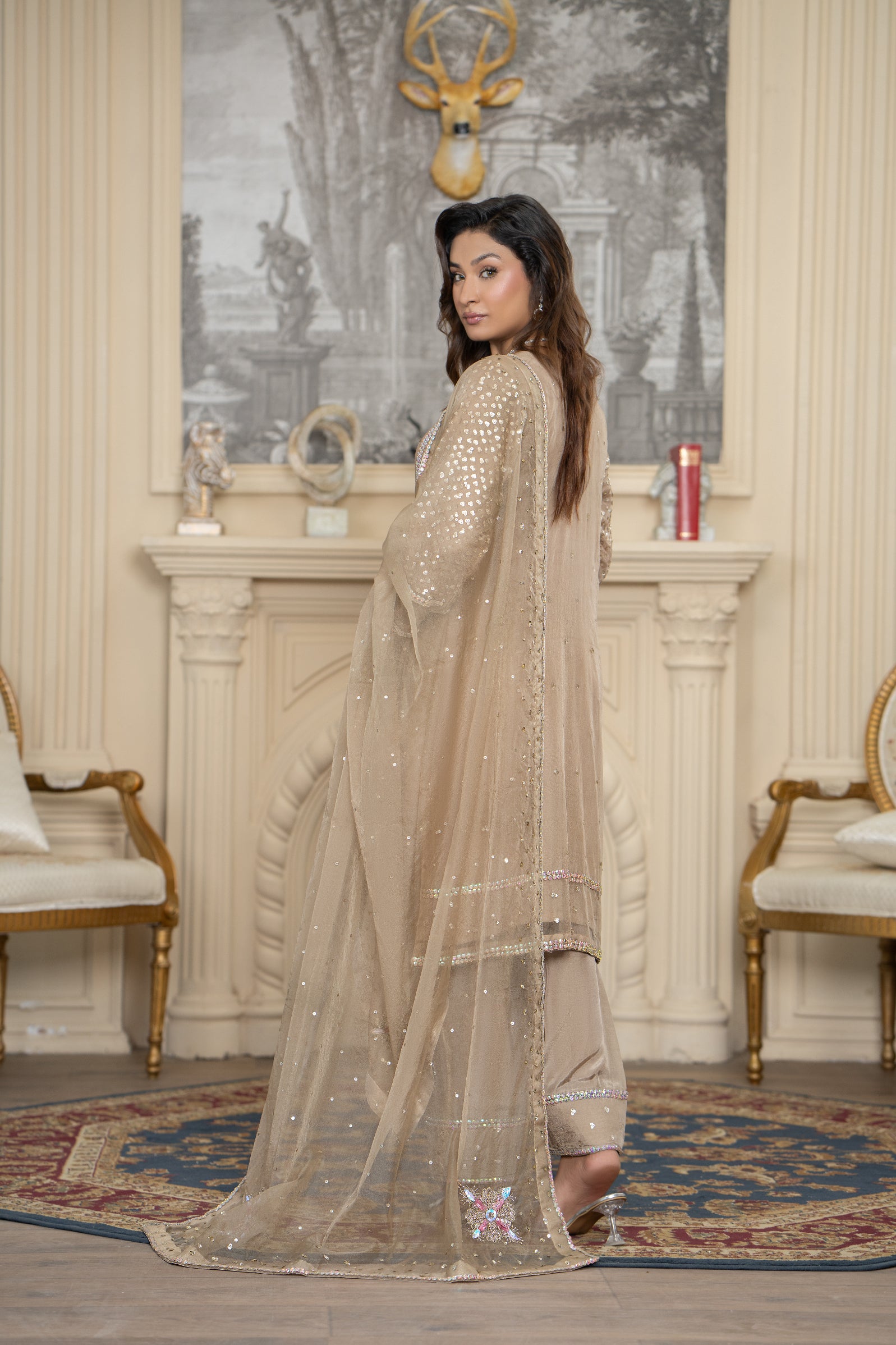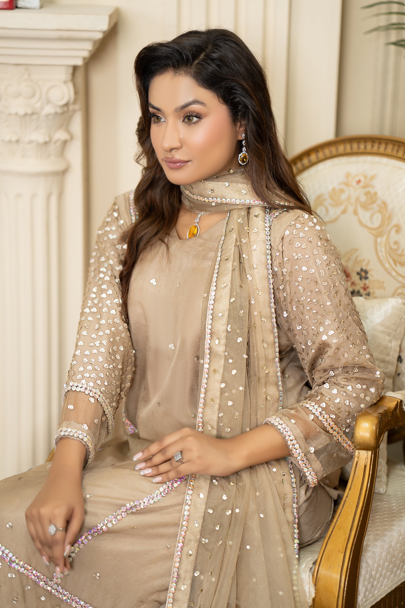 Radiate elegance in this beautiful desert sand suit. The luxurious silk kameez features a straight-cut silhouette, adorned with shimmering gold and multi-colored sequins for a dazzling effect. Paired with a matching trouser and a sheer organza dupatta with delicate embroidery and sequin work, this ensemble is the perfect choice for a sophisticated party or evening event.