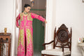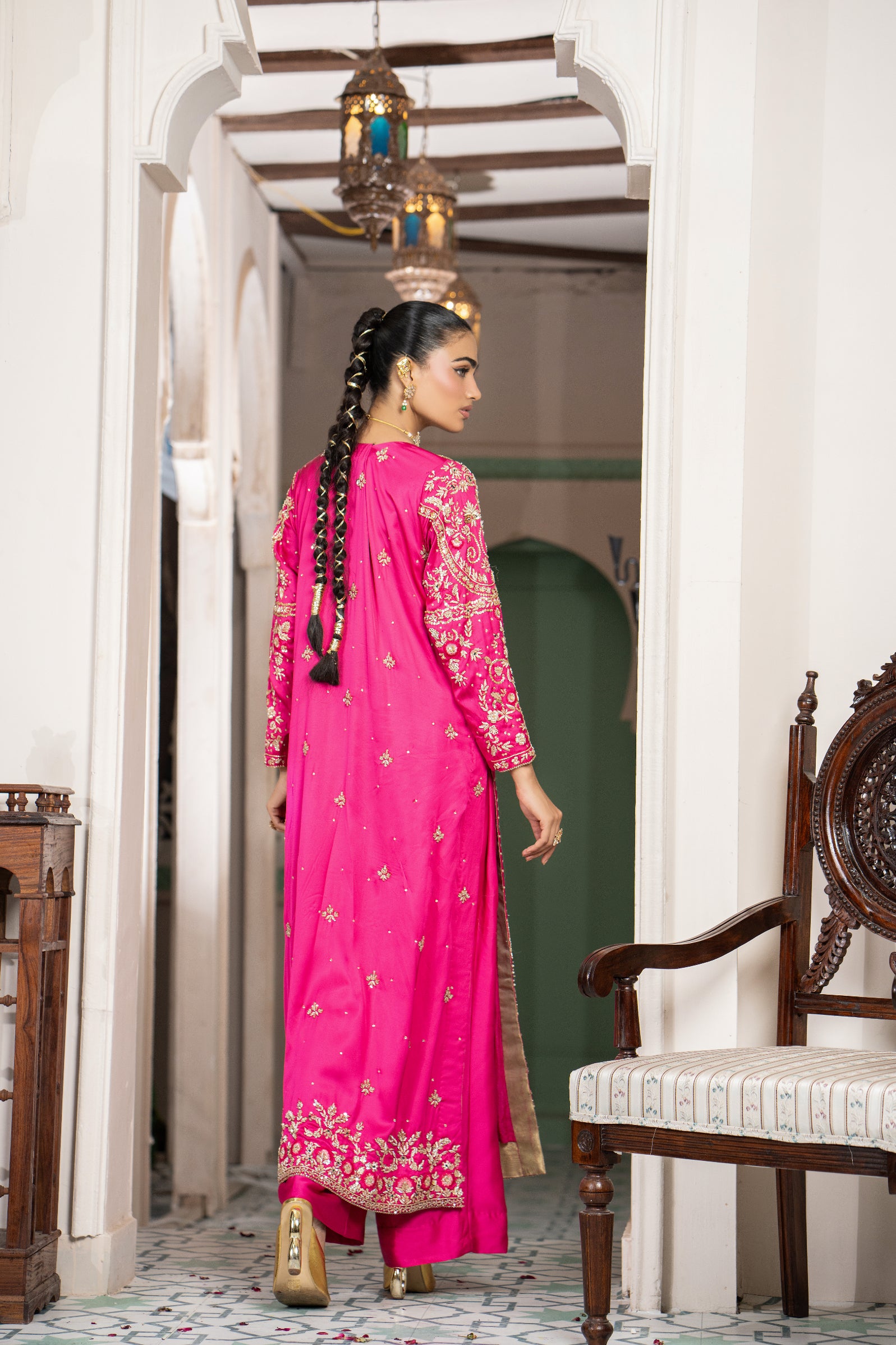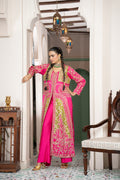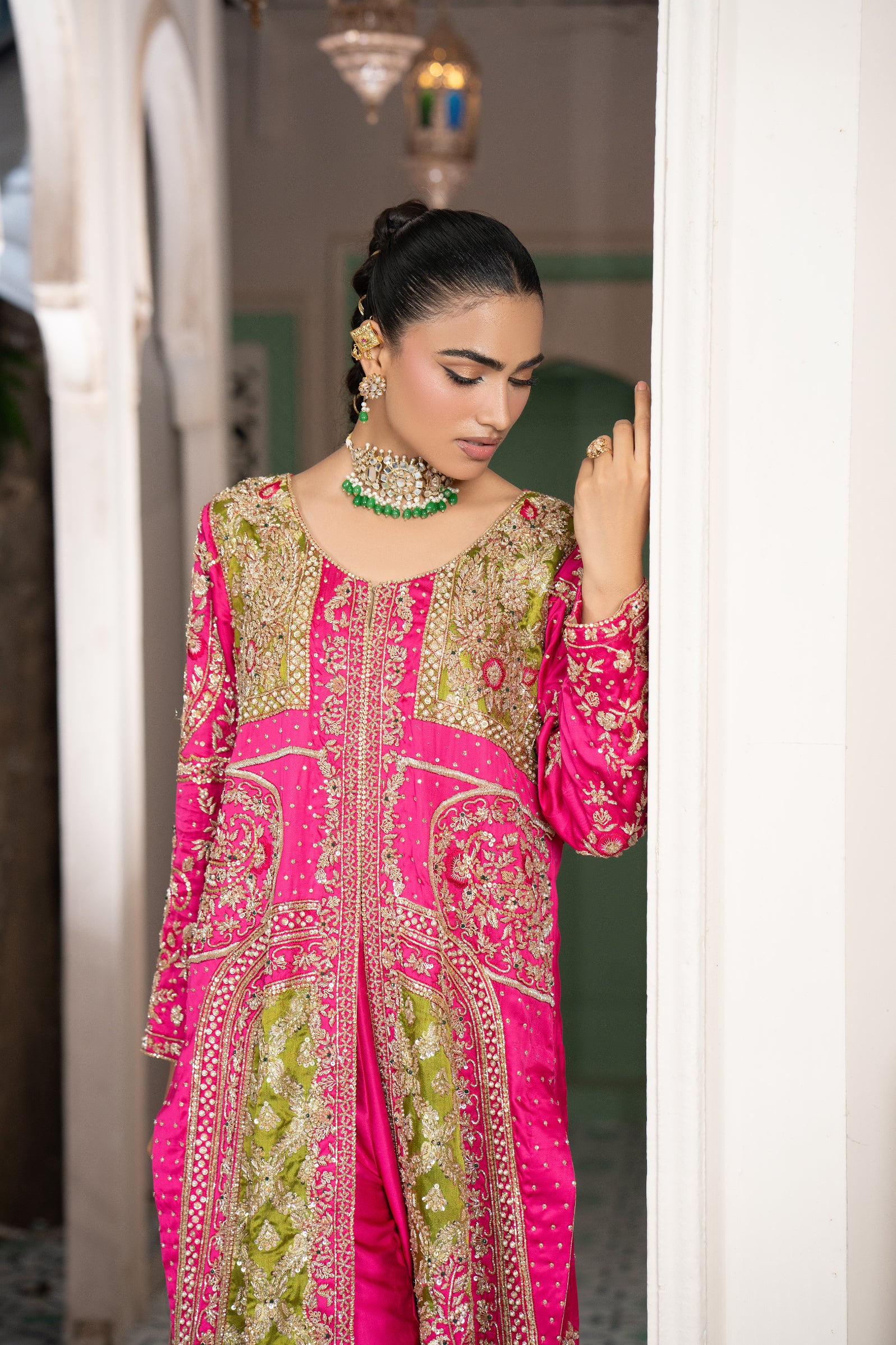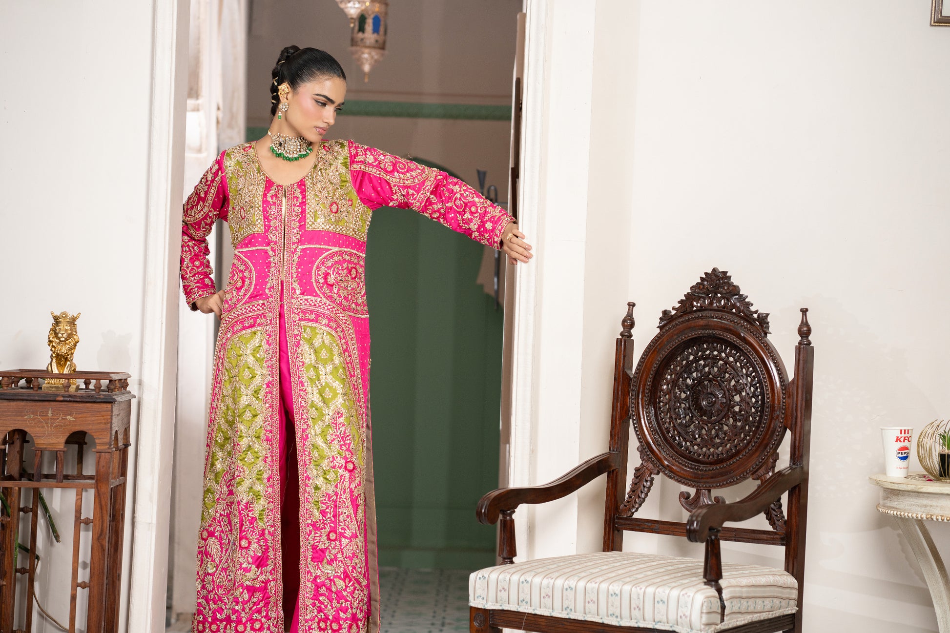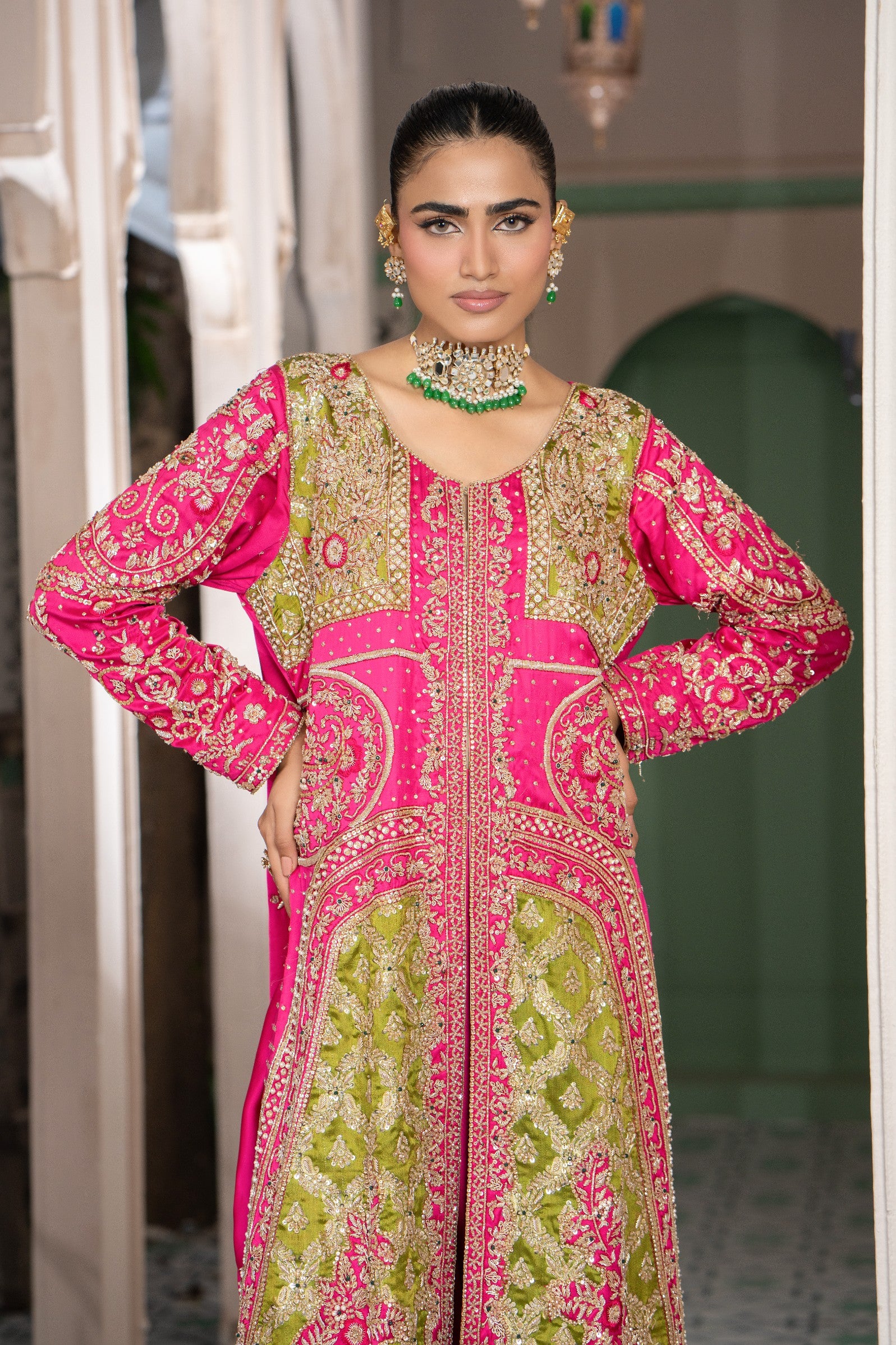 Make a bold, unforgettable statement in this vibrant fuchsia and chartreuse ensemble. The front-open, heavily embellished gown features intricate gold and silver embroidery, with a stunning contrast of colors. Paired with a flared silk lehanga, this outfit is designed for grand occasions. It's an impeccable choice for a luxury bridal or festive event.