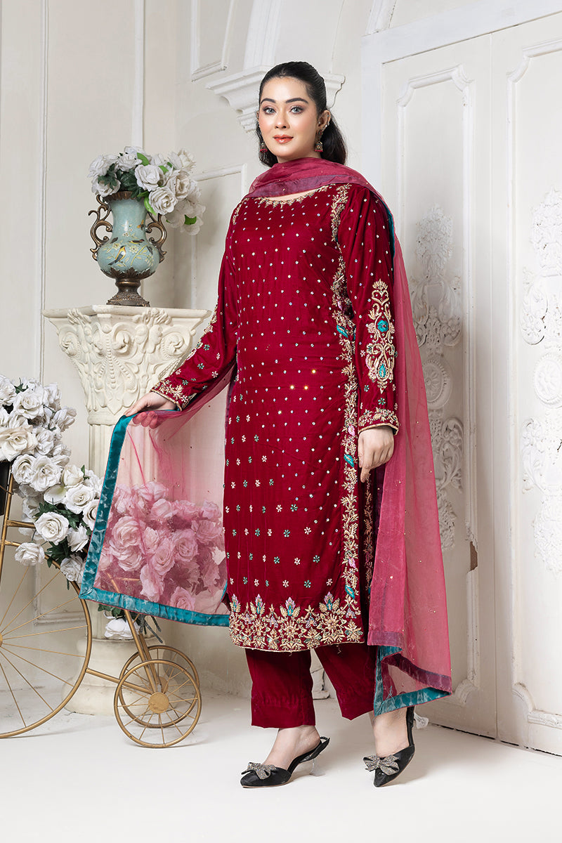 - Pure Velvet Shirt – Embellished with exquisite Resham, Cora, Zari, and Moti handwork, offering a regal and intricate touch.