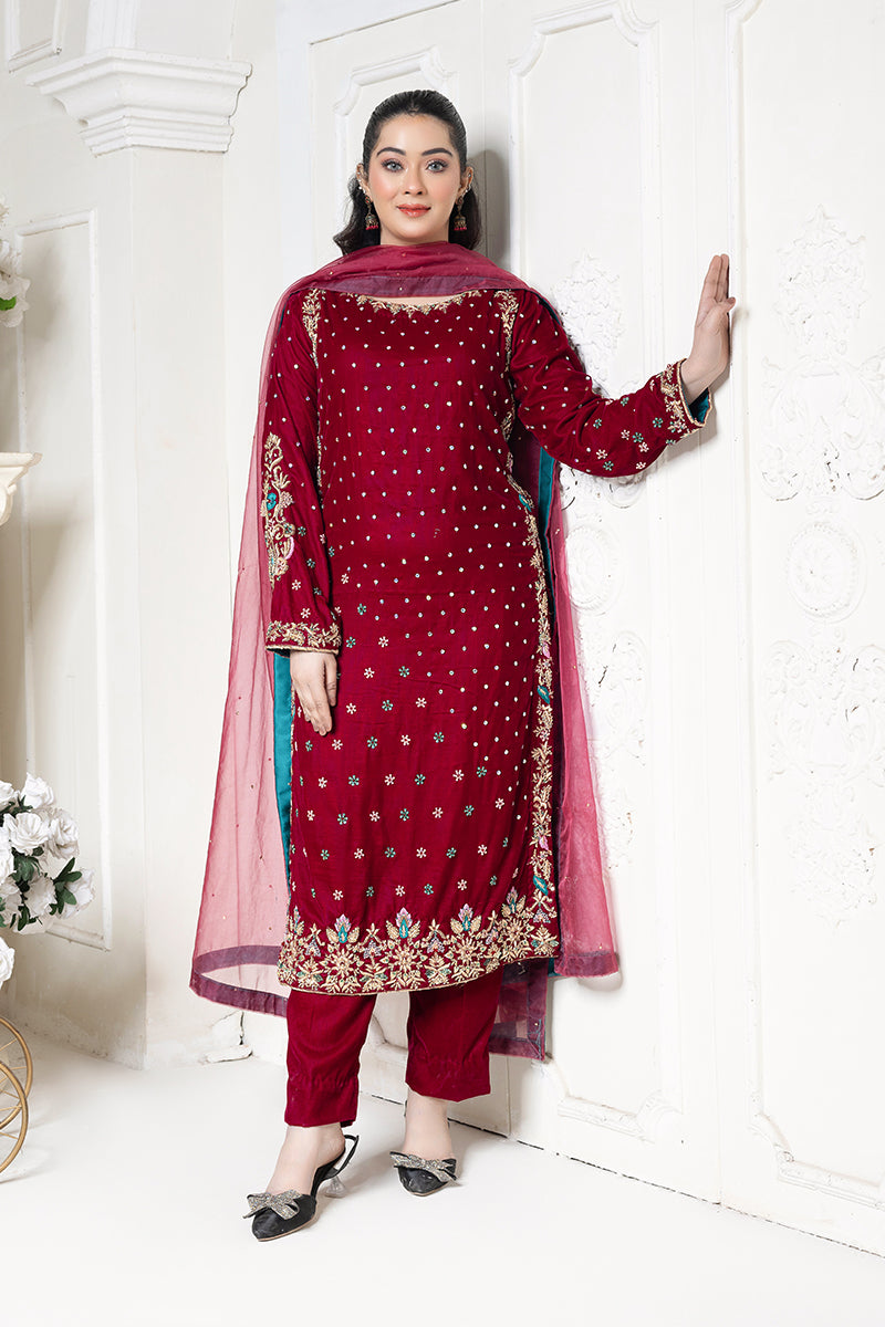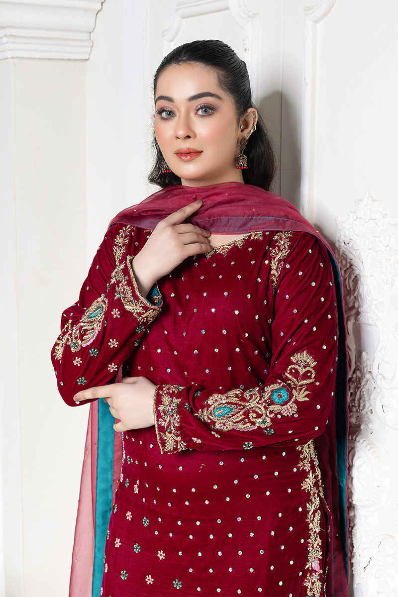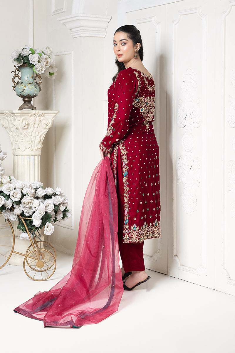 Step into sophistication with Garnet, an opulent 3-piece ensemble crafted to perfection. Designed with luxurious fabrics and intricate handmade detailing, this outfit embodies grace and grandeur for your special occasions.