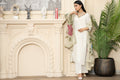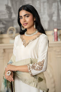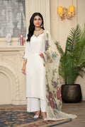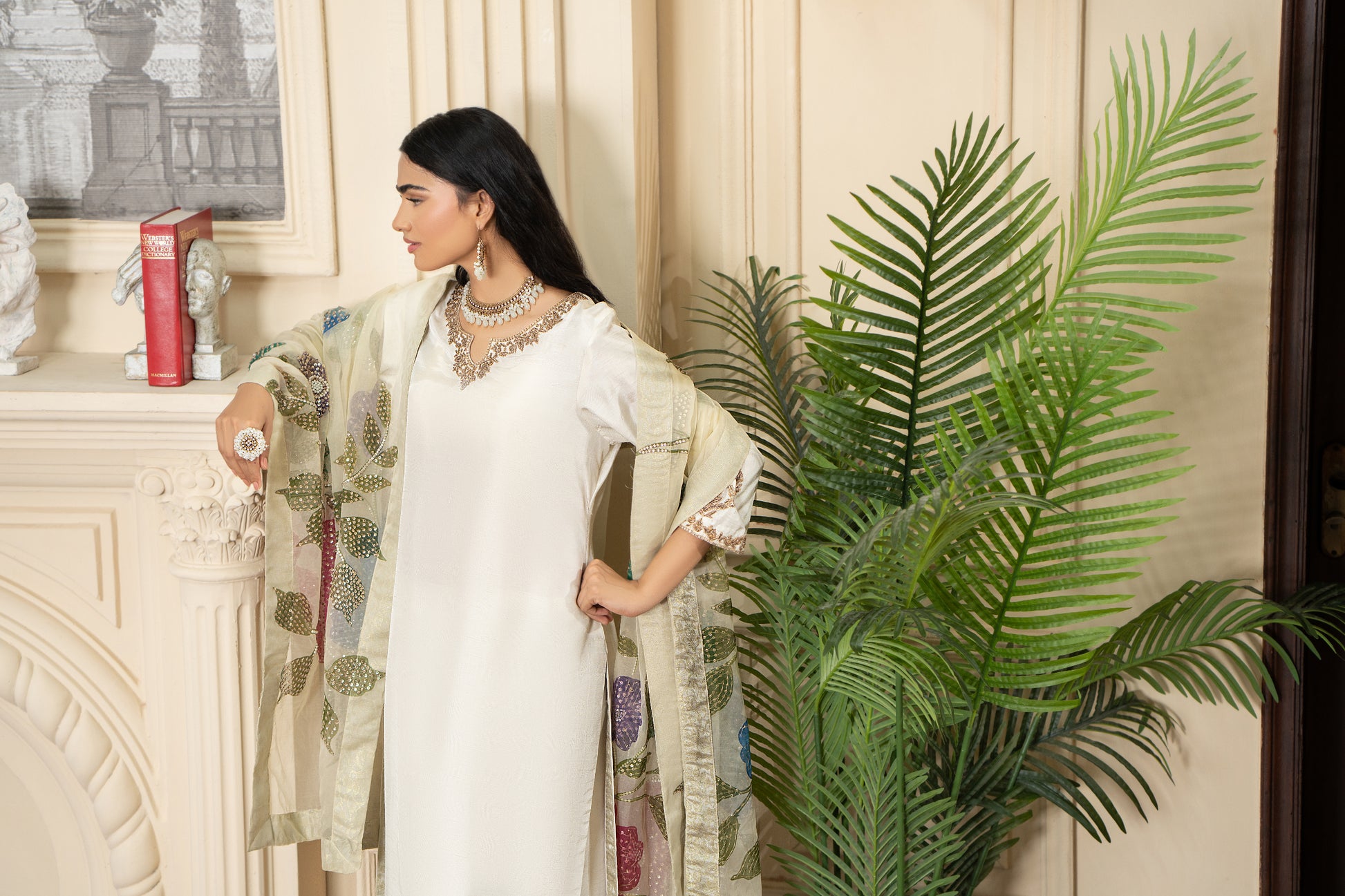 Radiate pure elegance in this luxurious ivory silk suit. The clean, straight-cut kameez features delicate embroidery on the sleeves and neckline, offering a touch of refined simplicity. The highlight is the stunningly vibrant net dupatta, which is richly adorned with multi-colored floral patterns and sequin embellishments, making this a perfect choice for a sophisticated party or evening event.