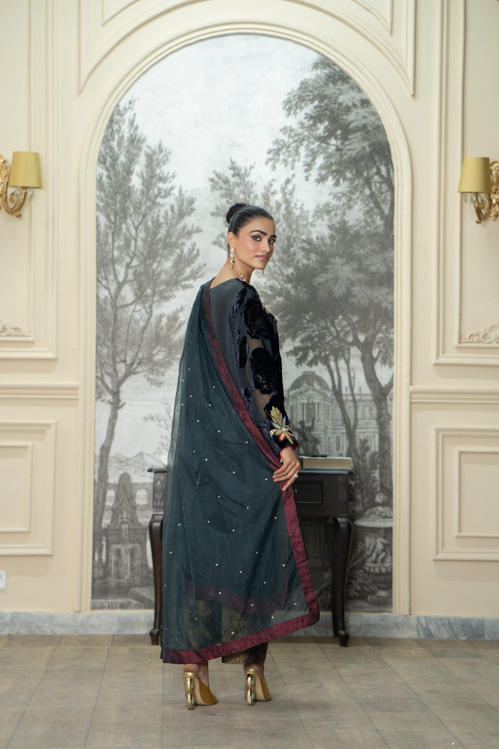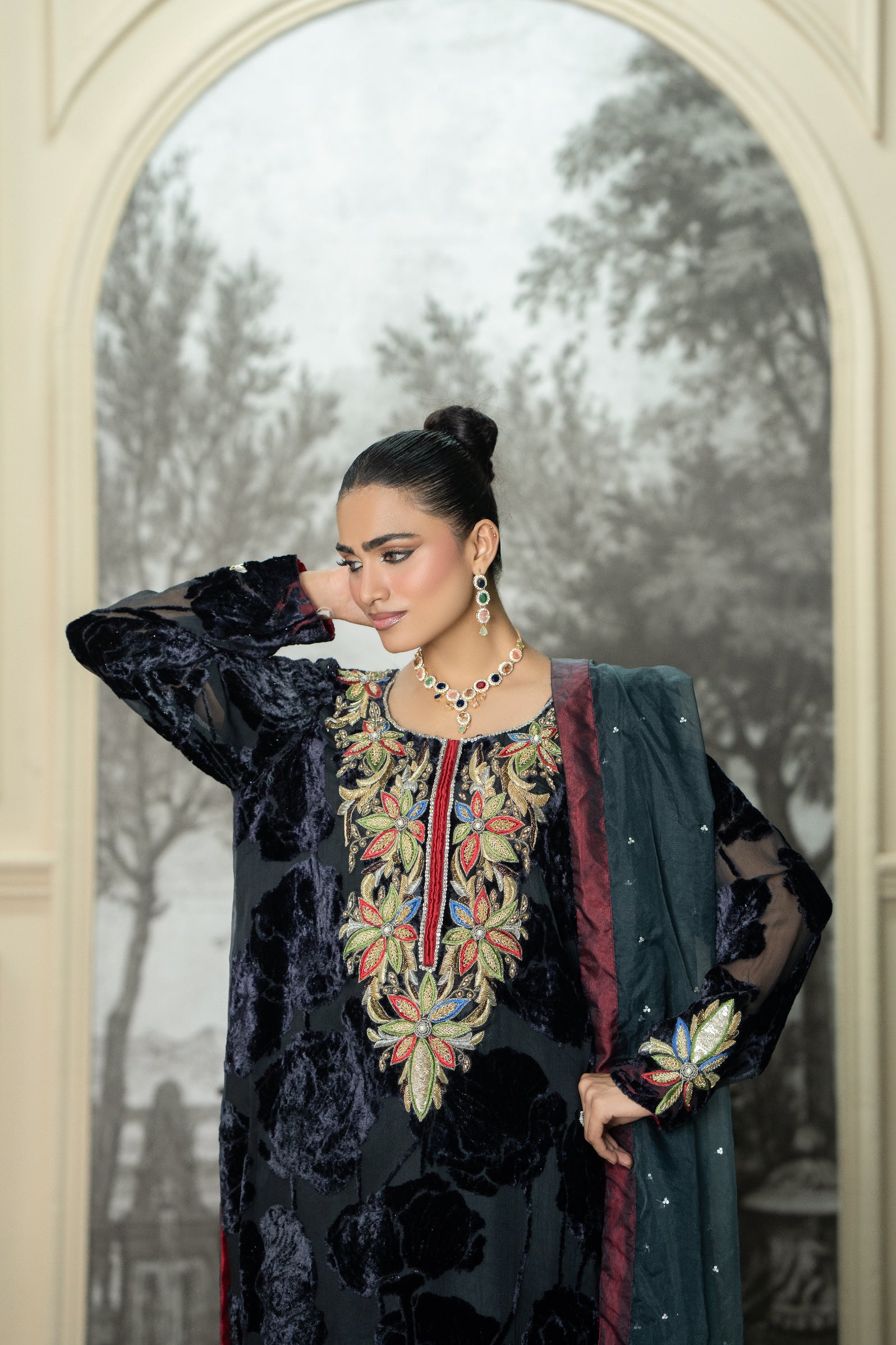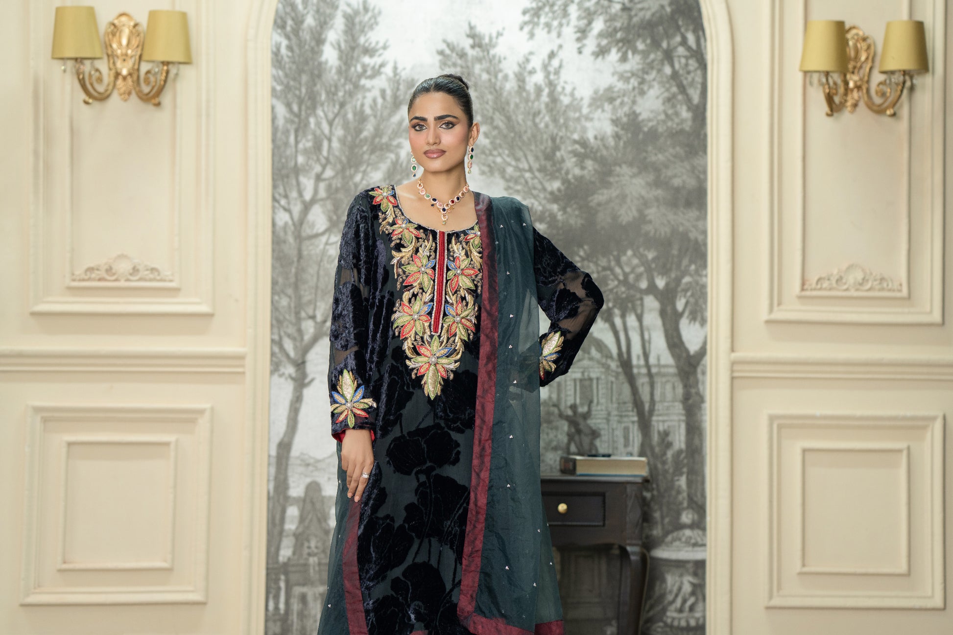 Radiate opulence in this exquisite midnight blue formal suit. The luxurious velvet kameez is a work of art, with rich embroidery and intricate golden detailing on the bodice and sleeves. It's elegantly paired with a regal golden jamawar trouser and a flowing net dupatta, creating a stunning and sophisticated look. This ensemble is perfect for a high-end party or elegant evening event.