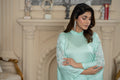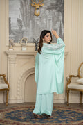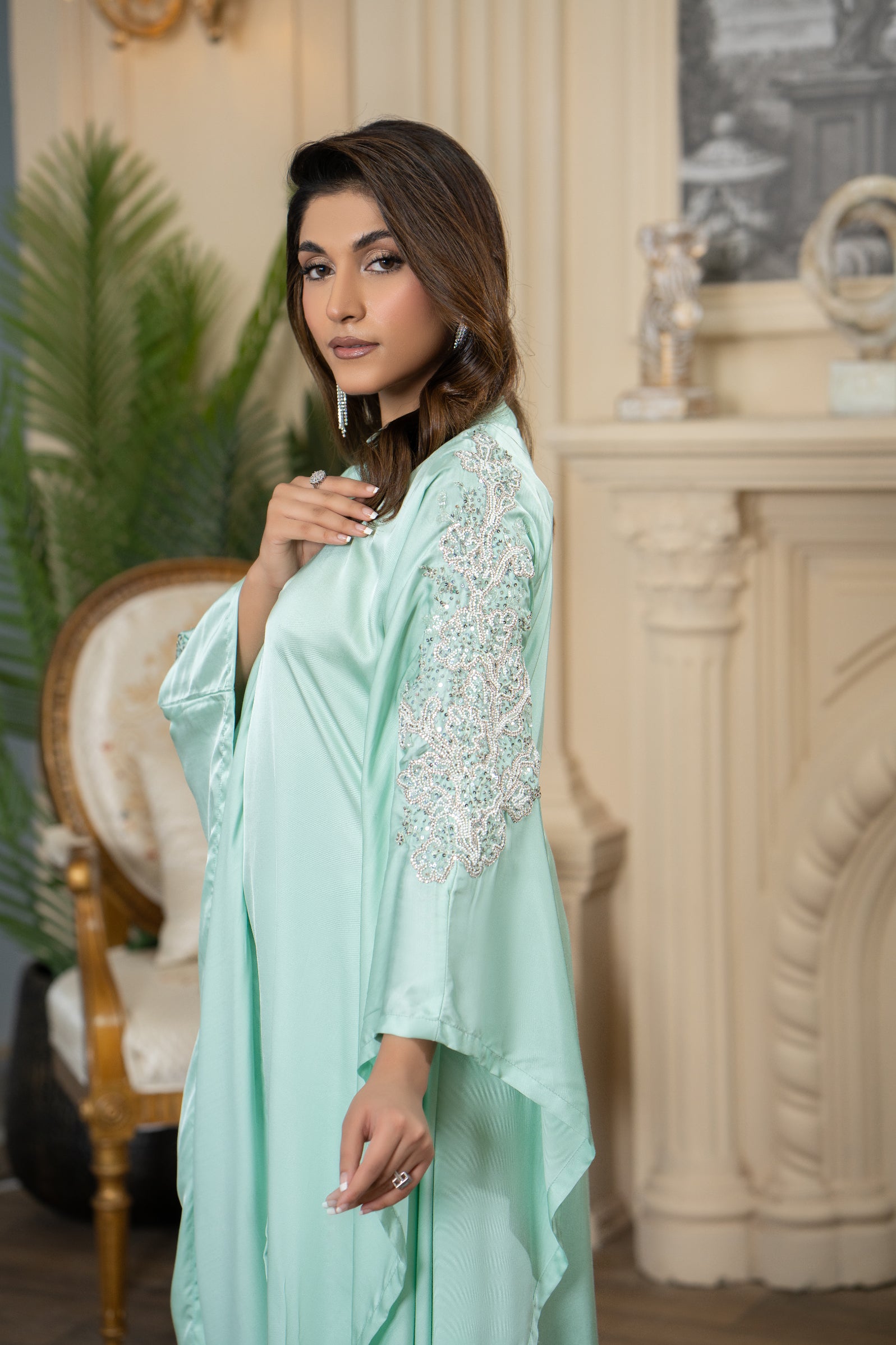 Experience modern elegance in this flowy mint green silk kaftan. The luxurious silhouette drapes gracefully, with delicate white floral embroidery adorning the sleeves and high neckline, adding a touch of sophisticated charm. Paired with a stylish trouser, this elegant two-piece ensemble is perfect for a chic party or special evening event, blending comfort with a high-fashion aesthetic.