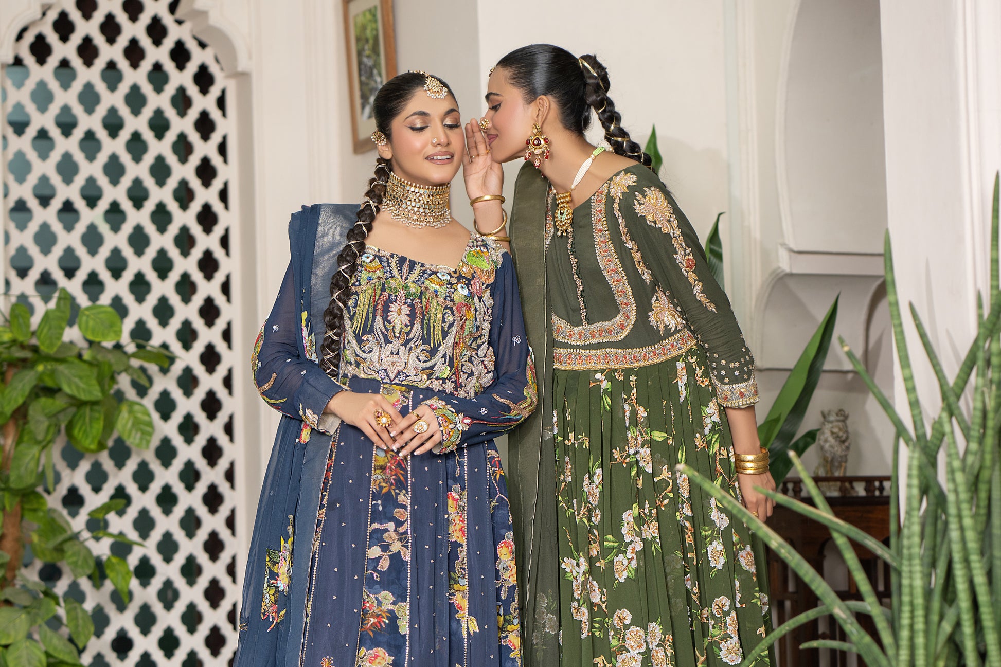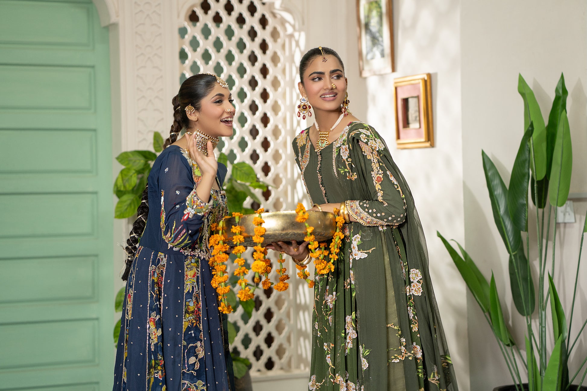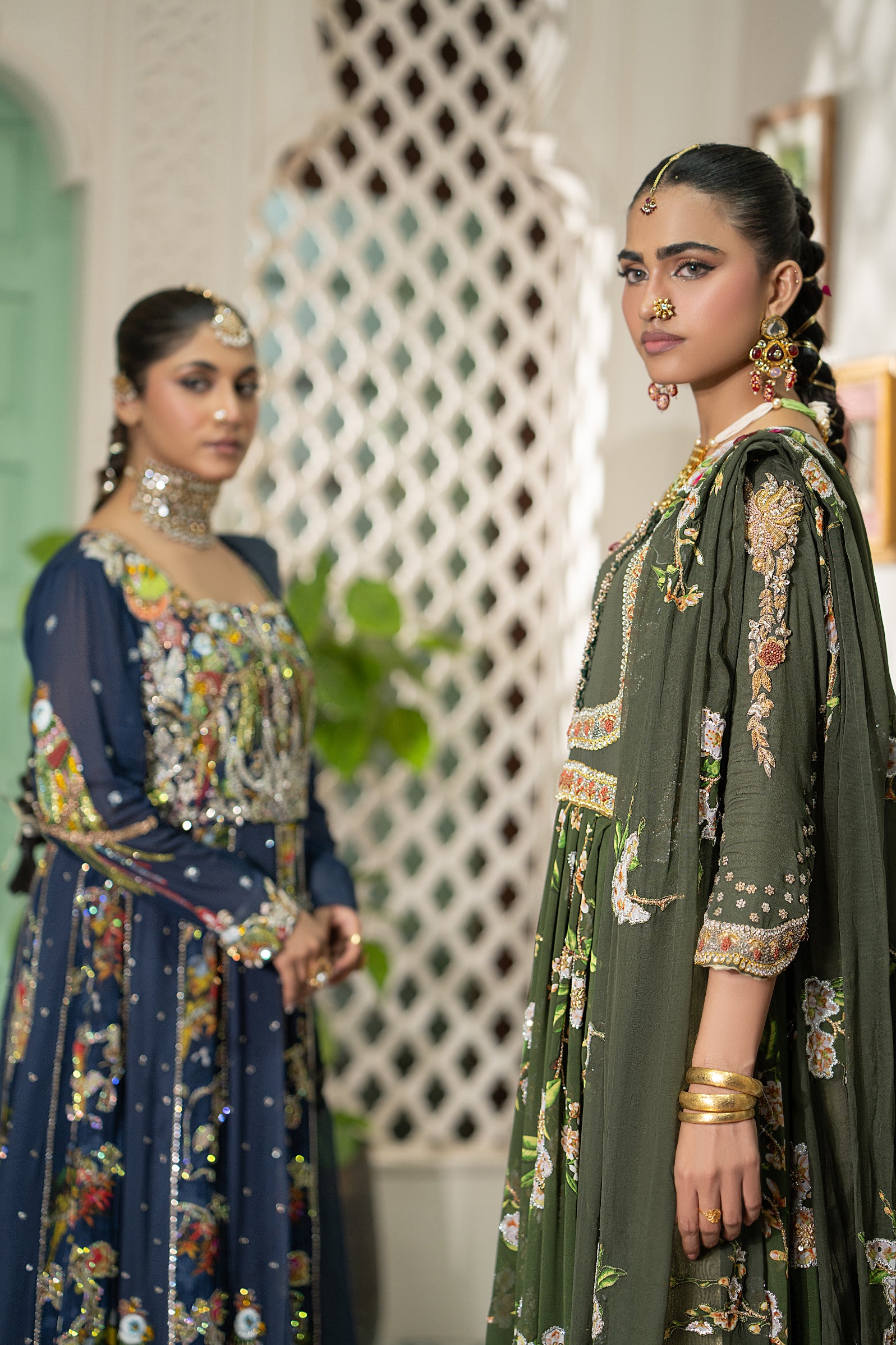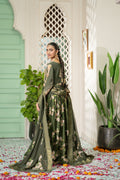 Radiate grace in this elegant olive green pishwas. This luxurious chiffon gown features a beautifully flared silhouette with intricate floral prints and delicate embellishments along the neckline and sleeves. Paired with a matching plain chiffon dupatta, this ensemble is perfect for formal occasions, offering a sophisticated blend of traditional design and contemporary style.