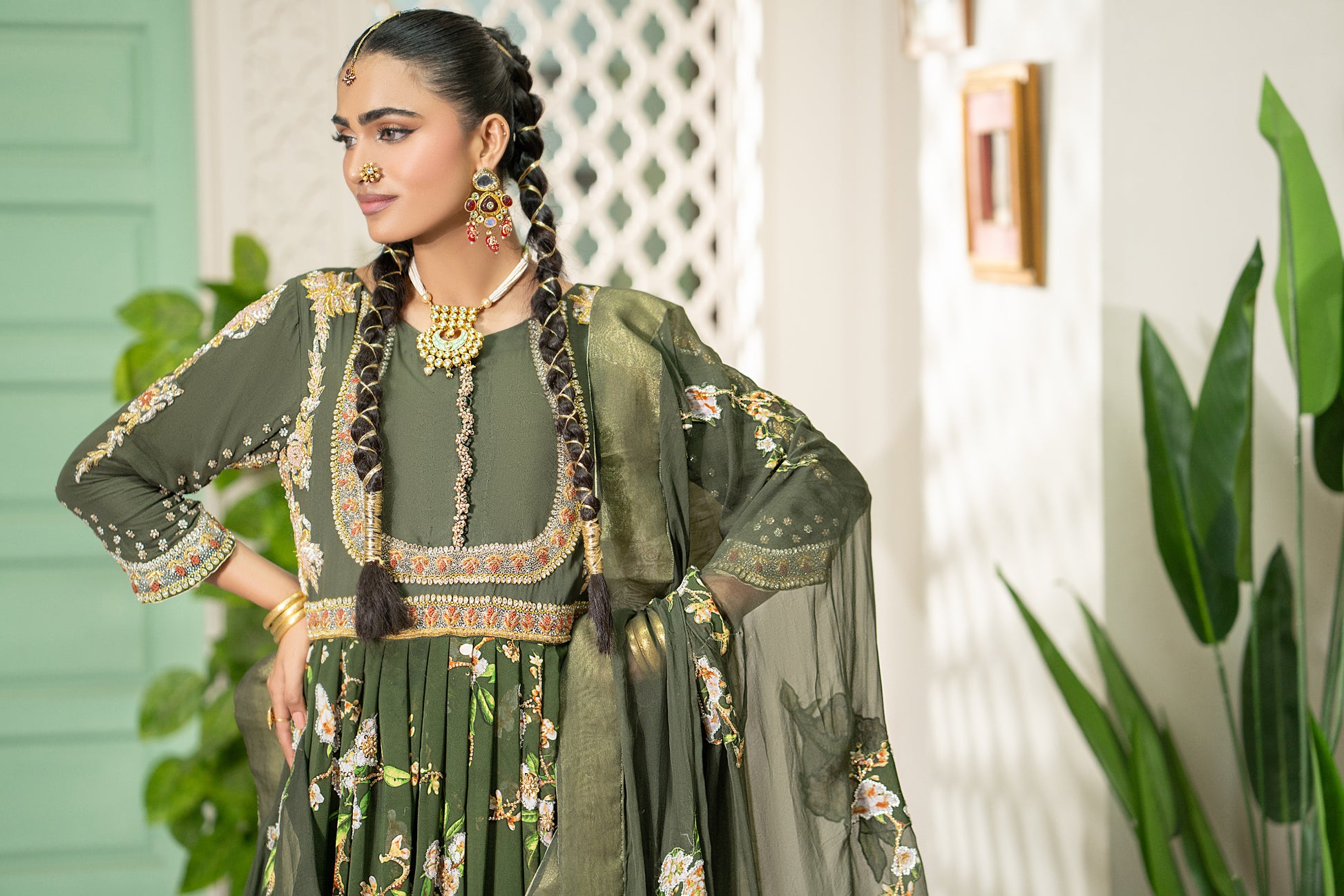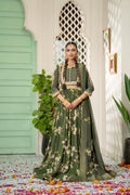 Olive Green Floral Printed Pishwas