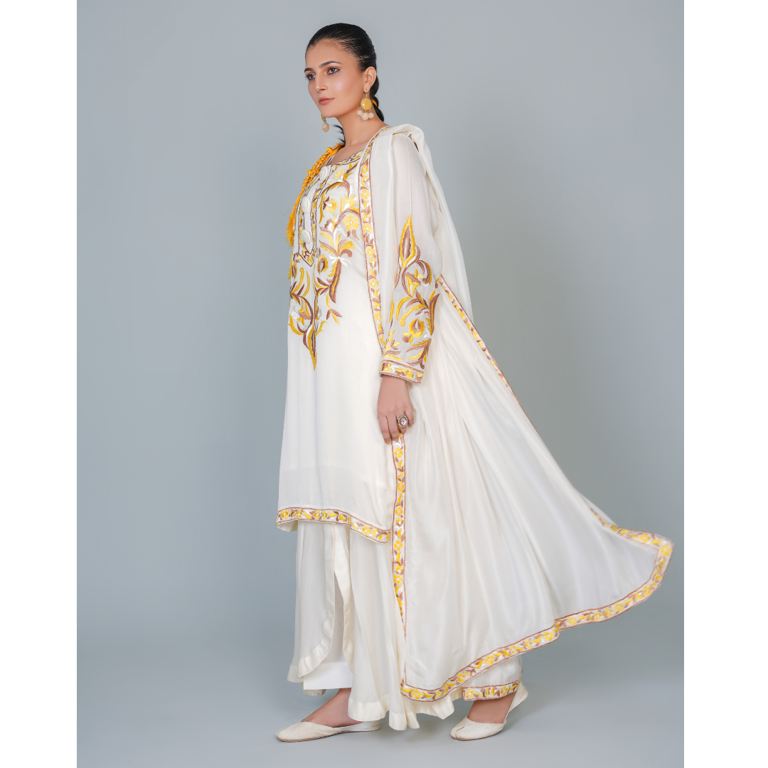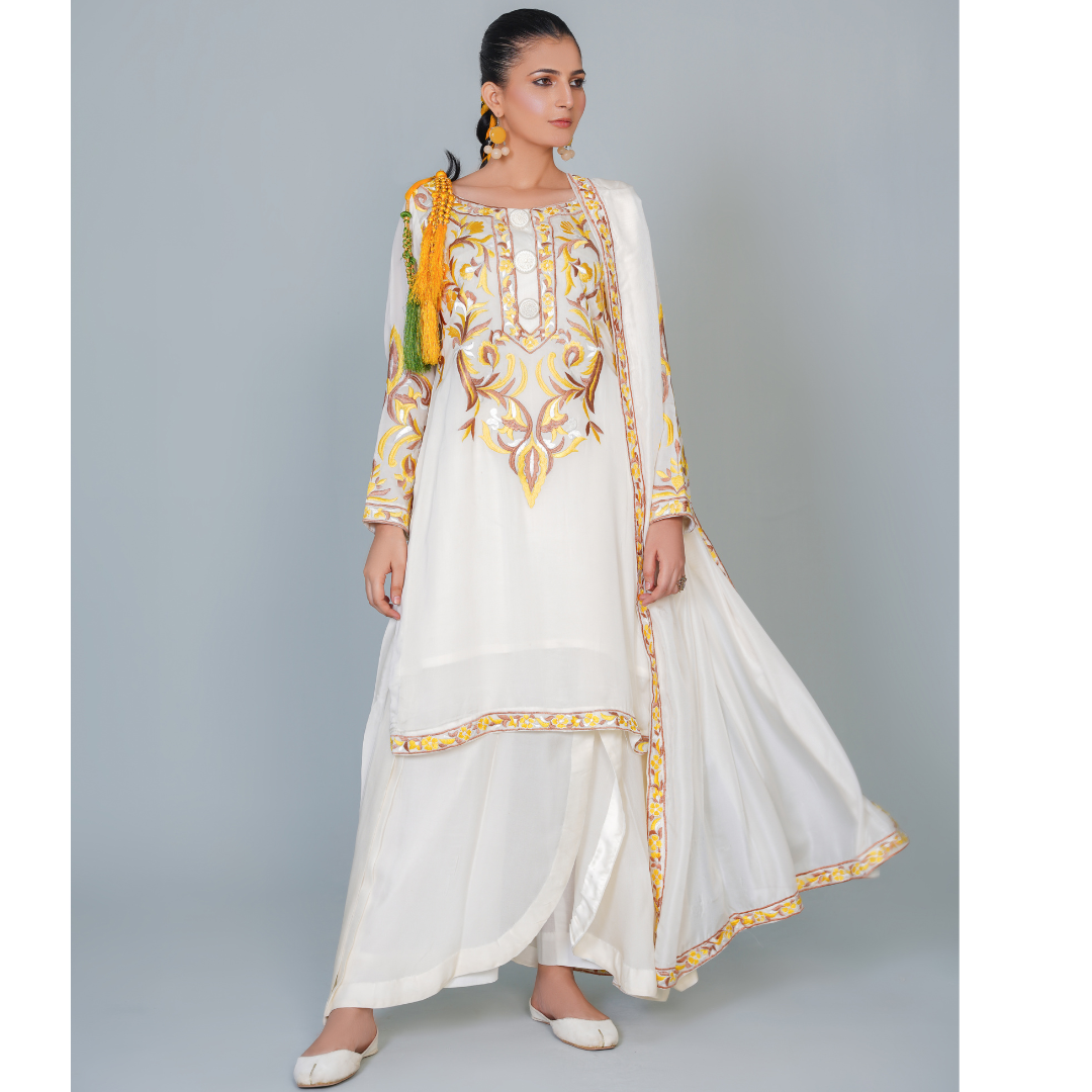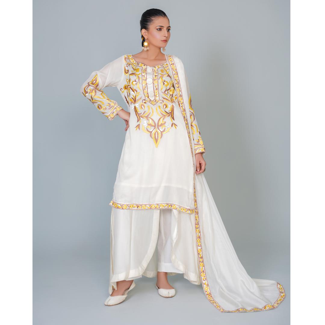 Features: Experience luxury in our three piece pure silk ensemble, featuring a stunning kurta, dupatta, and lacha style trouser. Adorned with intricate Resham embroidery, this outfit exudes elegance and sophistication, perfect for special occasions. Feel the richness of pure silk and the beauty of traditional craftsmanship.