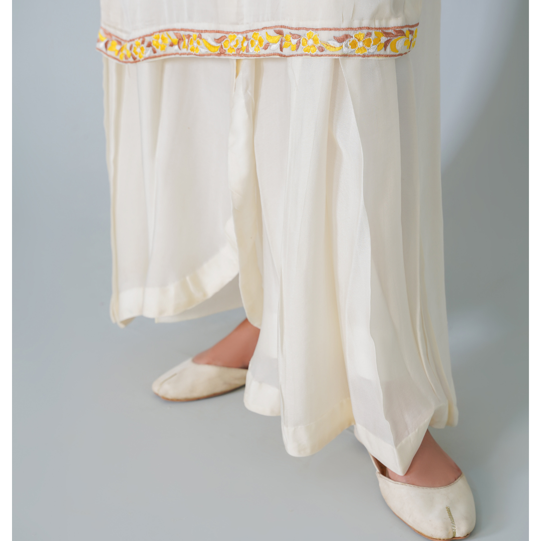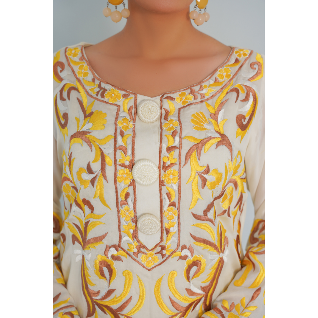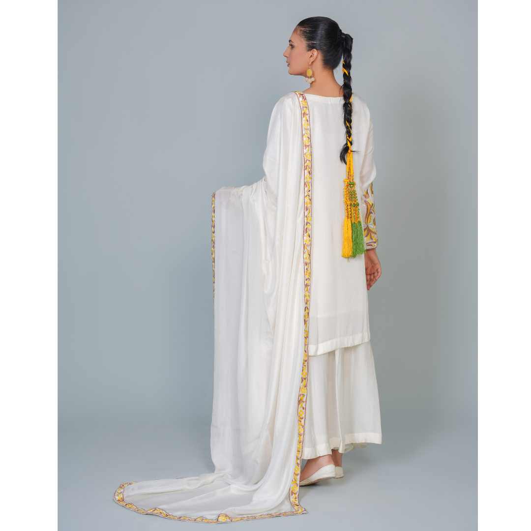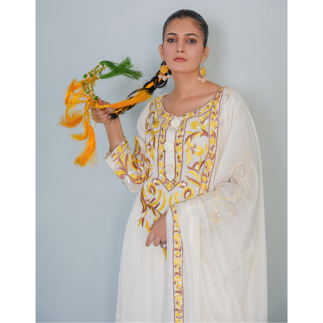 Features: Experience luxury in our three piece pure silk ensemble, featuring a stunning kurta, dupatta, and lacha style trouser. Adorned with intricate Resham embroidery, this outfit exudes elegance and sophistication, perfect for special occasions. Feel the richness of pure silk and the beauty of traditional craftsmanship.