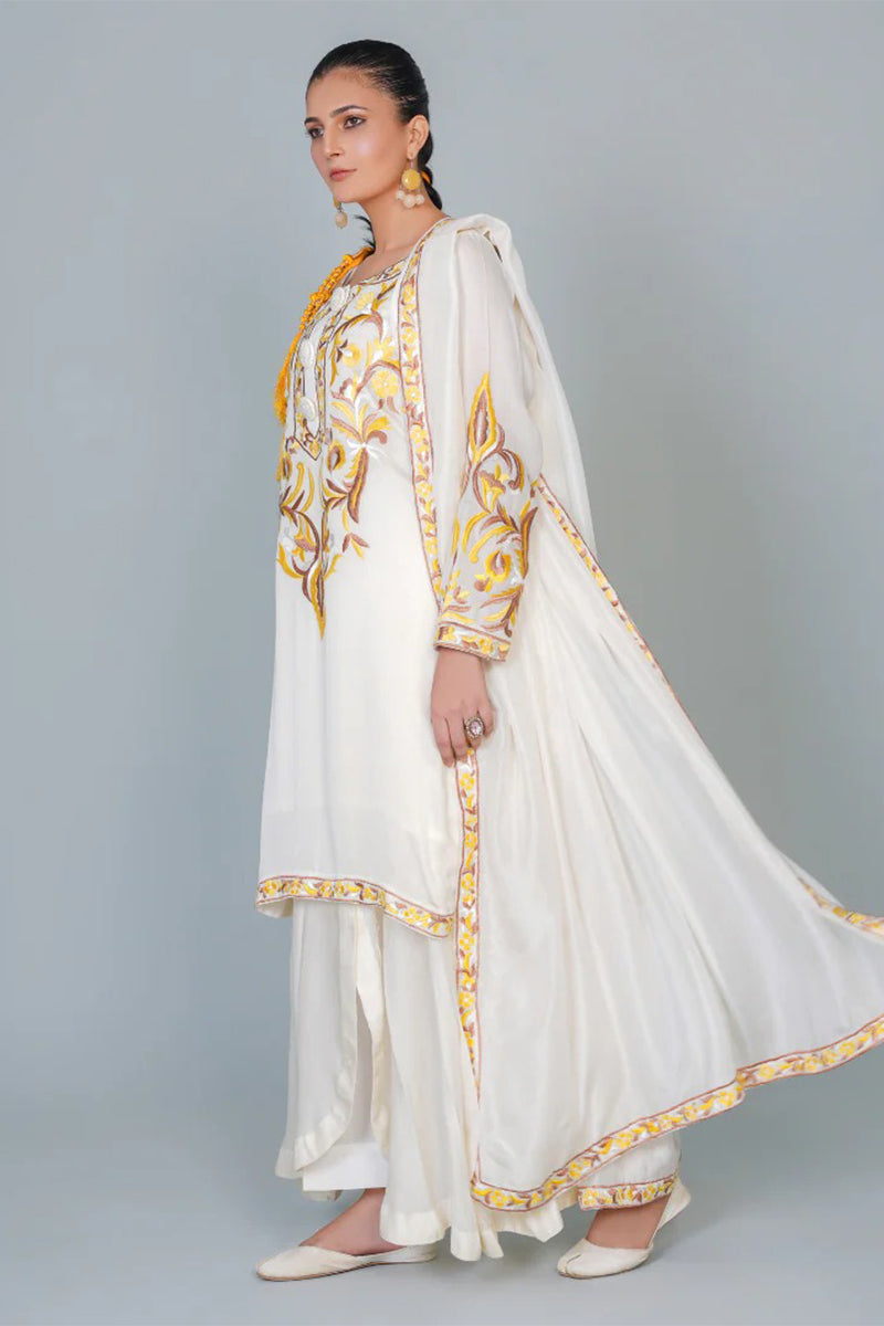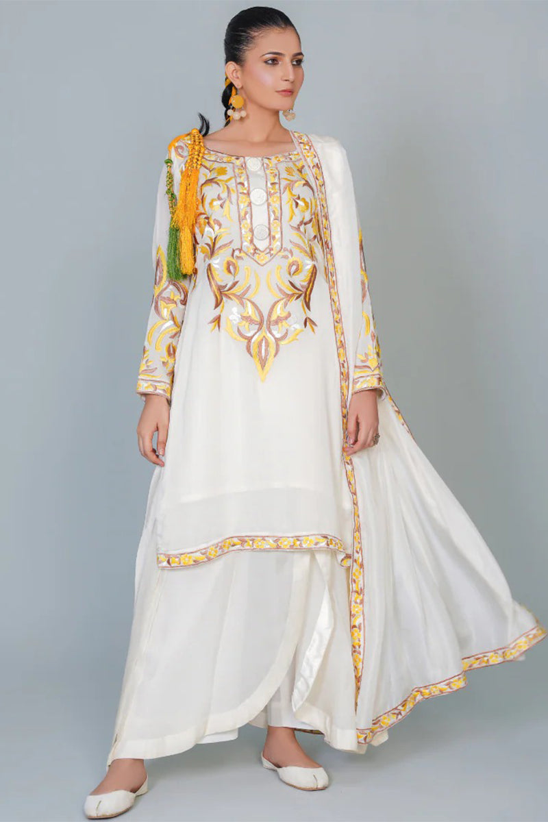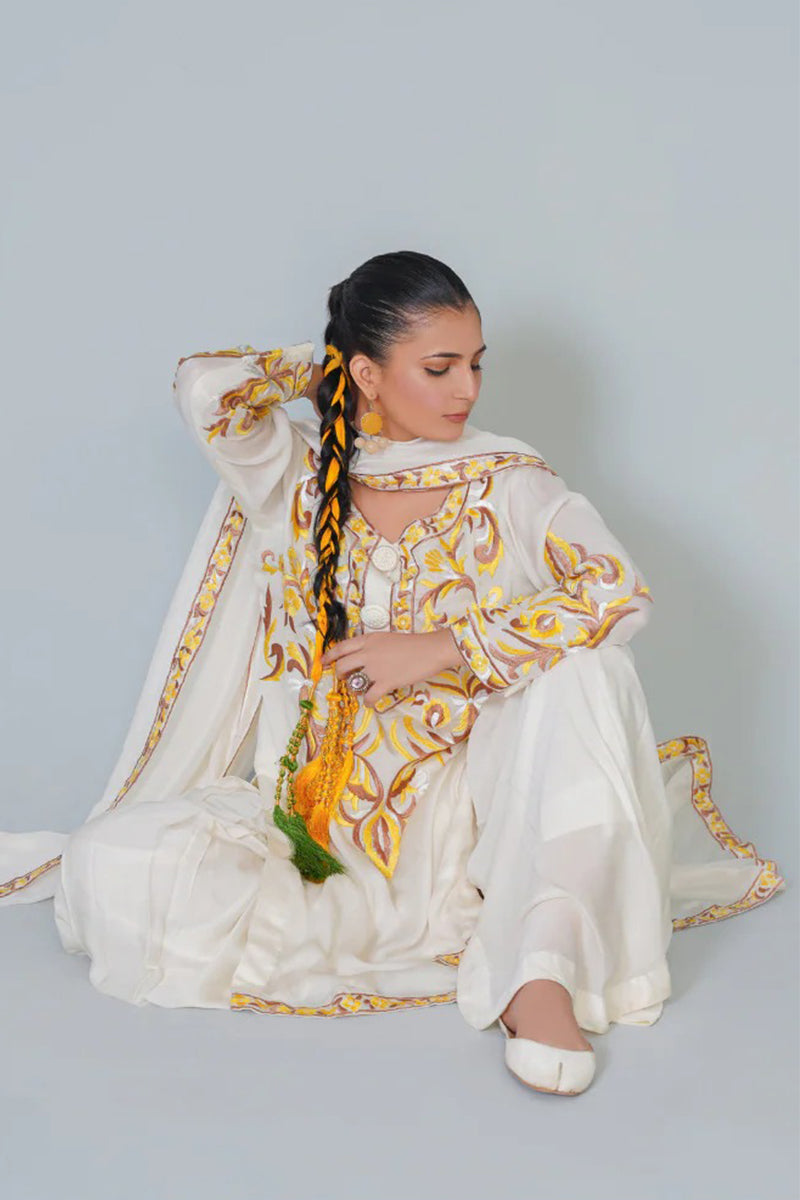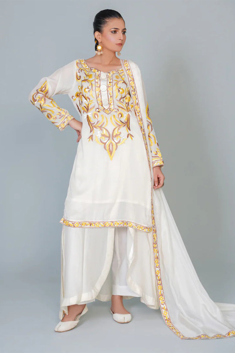 Experience luxury in our three piece pure silk ensemble, featuring a stunning kurta, dupatta, and lacha style trouser. Adorned with intricate Resham embroidery, this outfit exudes elegance and sophistication, perfect for special occasions. Feel the richness of pure silk and the beauty of traditional craftsmanship.