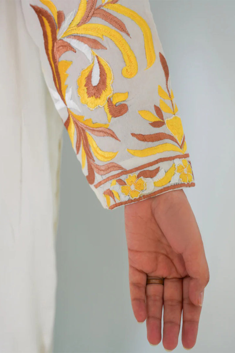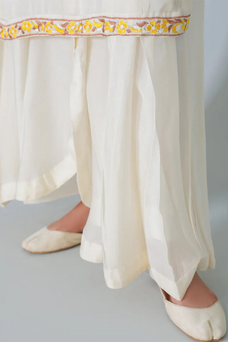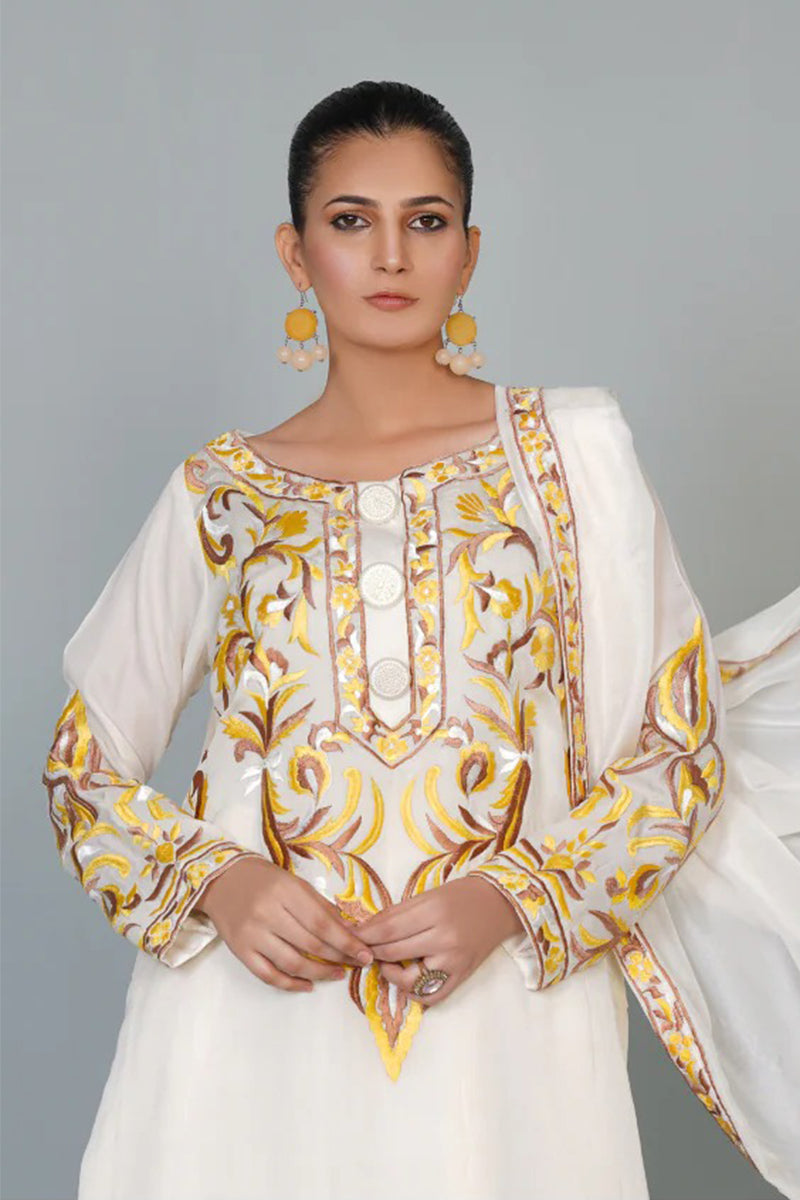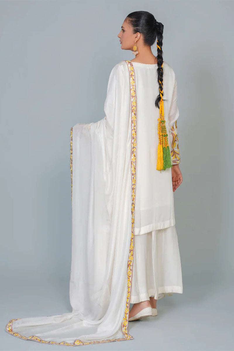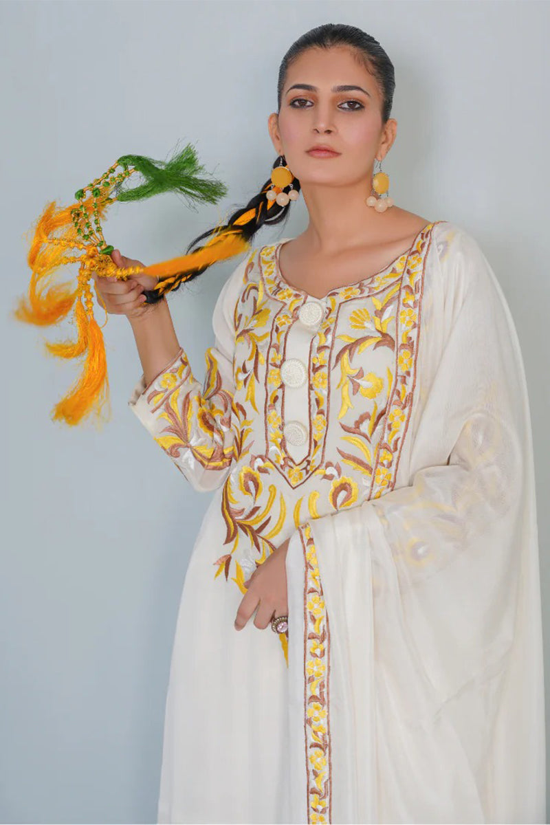 Experience luxury in our three piece pure silk ensemble, featuring a stunning kurta, dupatta, and lacha style trouser. Adorned with intricate Resham embroidery, this outfit exudes elegance and sophistication, perfect for special occasions. Feel the richness of pure silk and the beauty of traditional craftsmanship.