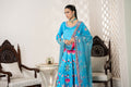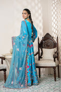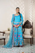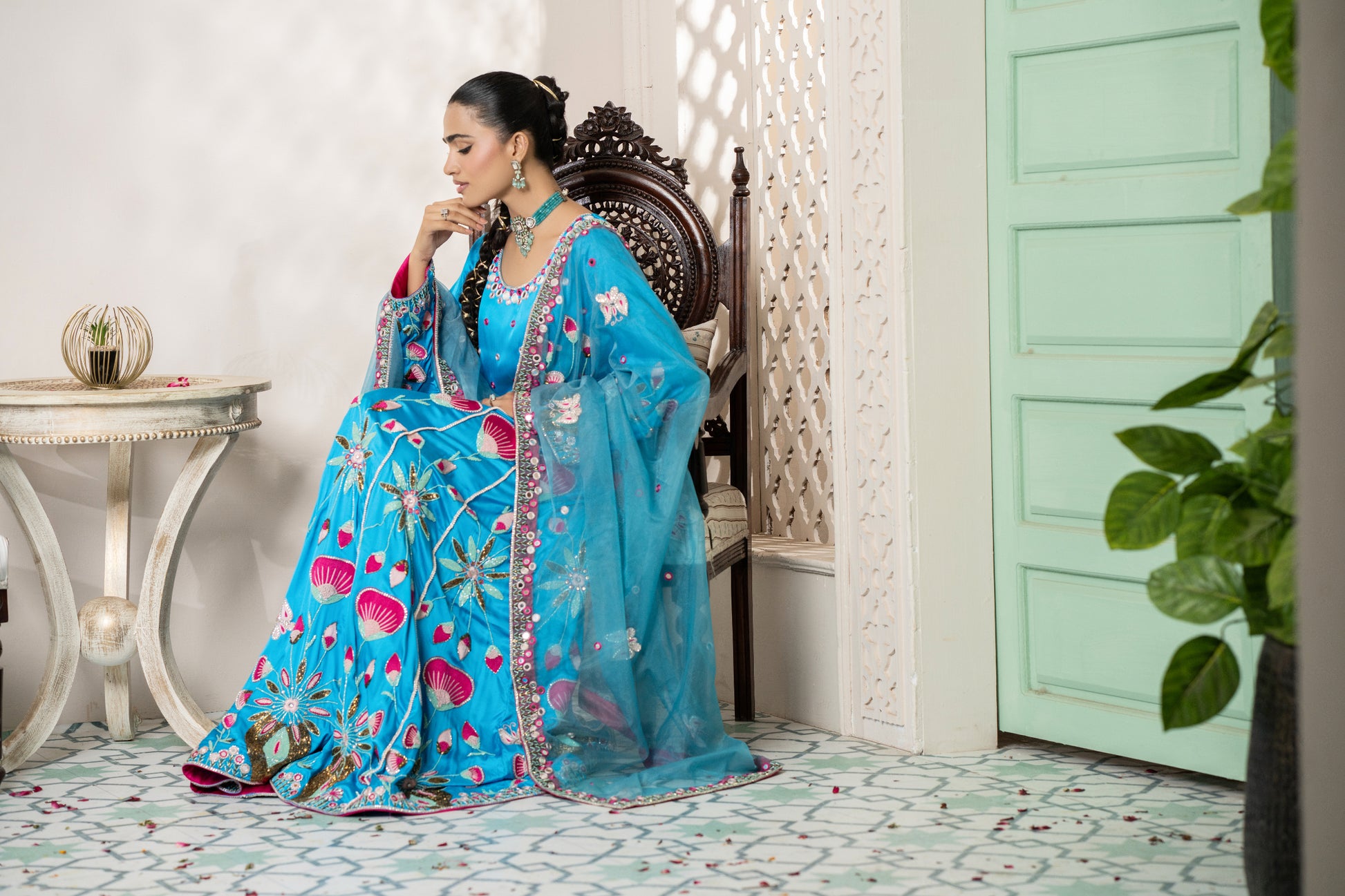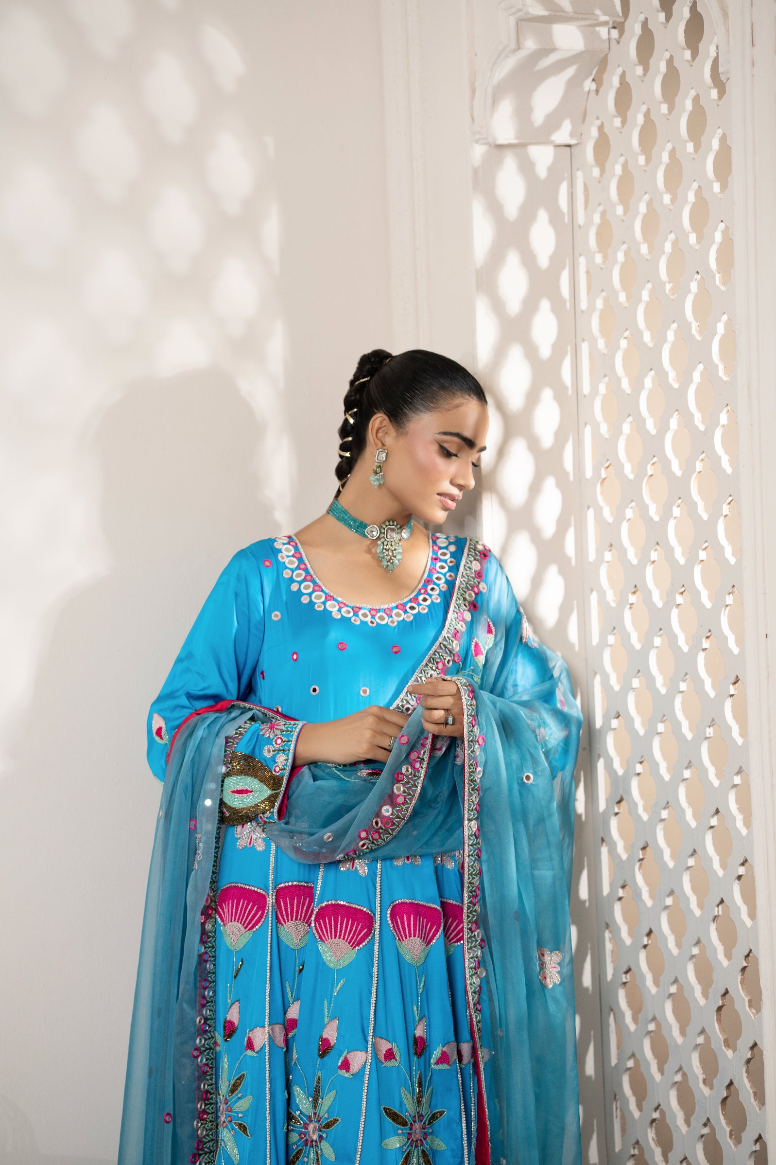 Step into a world of elegance with this enchanting serenity blue pishwas. The flared gown is exquisitely adorned with intricate embroidery in a vibrant pink and blue color palette. The luxurious fabric drapes beautifully, while the detailed floral motifs and sparkling embellishments add a touch of opulence. Paired with a matching net dupatta, this ensemble is perfect for a sophisticated formal event or a luxury celebration.